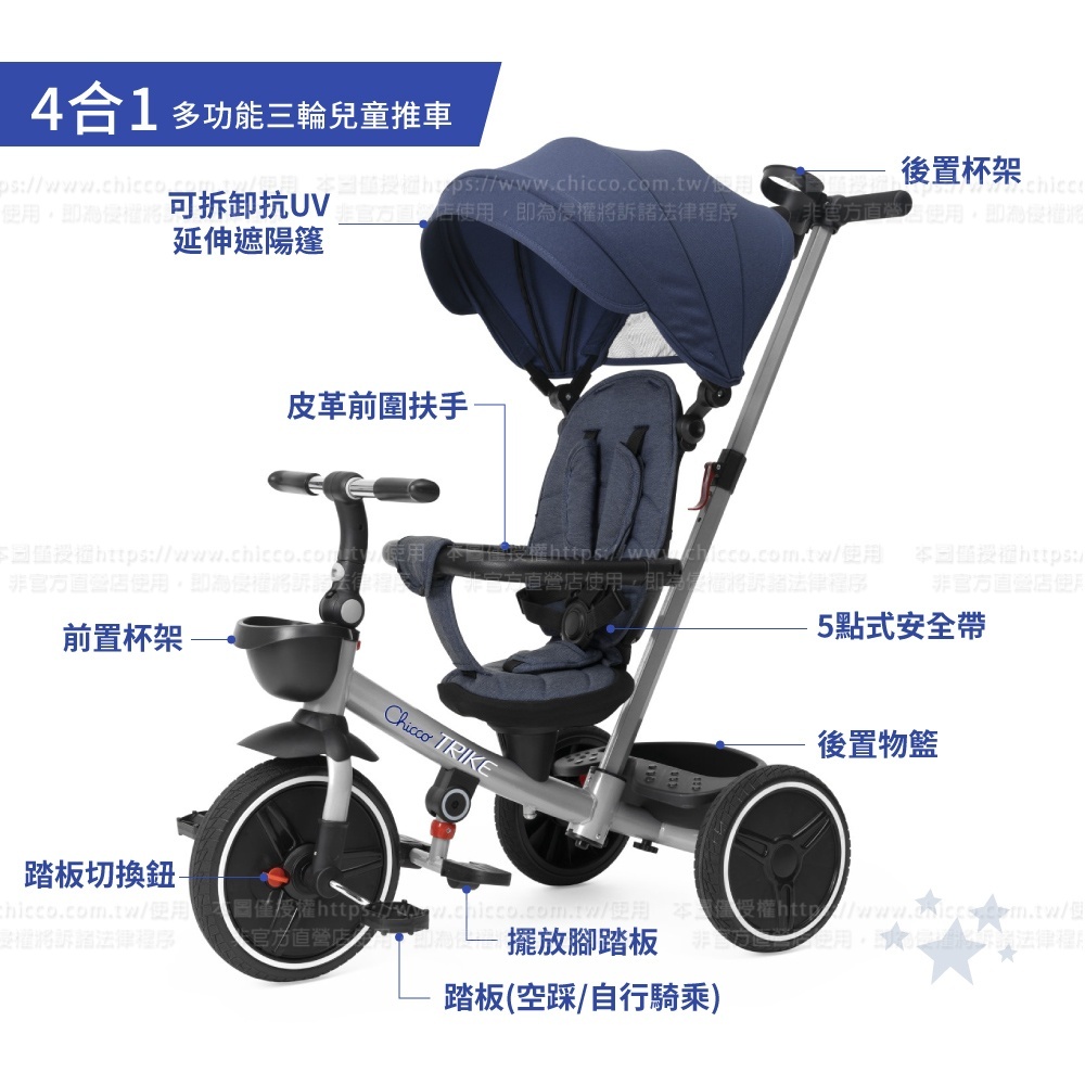 ●後方推行桿,高度可調,亦可拆卸轉為三輪車。