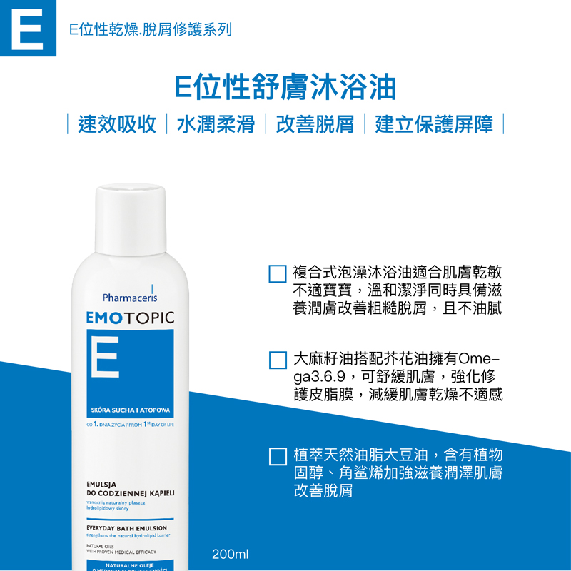 •複合式泡澡沐浴油適合肌膚乾敏不適寶寶,溫和潔淨同時具備滋養潤膚改善粗糙脫屑,且不油膩