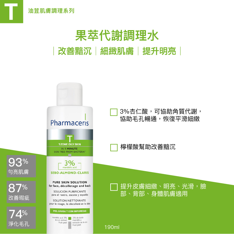 •杏仁酸親脂性果酸,溫和不刺激,可協助角質代謝、淨化毛孔、降低阻塞困擾