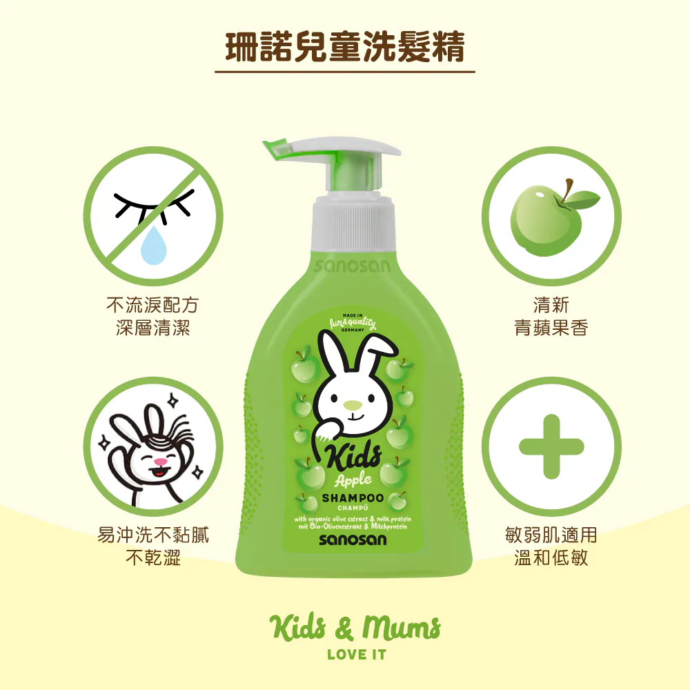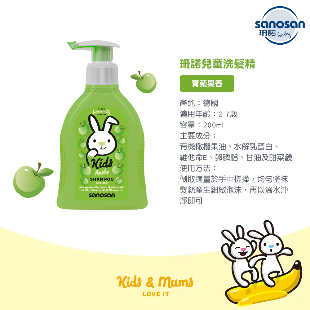 珊諾KIDS兒童洗髮精200ml-青蘋果【單品8折;滿$488送珊諾BABY旅行組1組 送完為止】