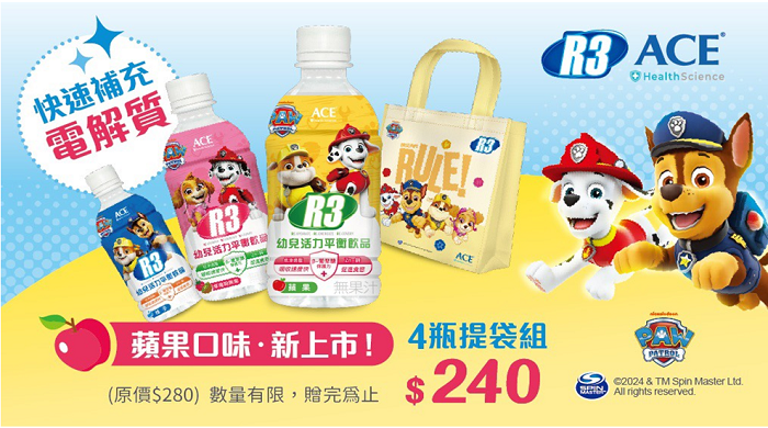 ACE R3幼兒活力平衡飲品350ml系列,4罐特價240元再送汪汪隊袋子,送完為止