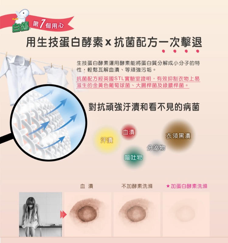 •生技蛋白酵素,有效去除血漬及衣領髒污