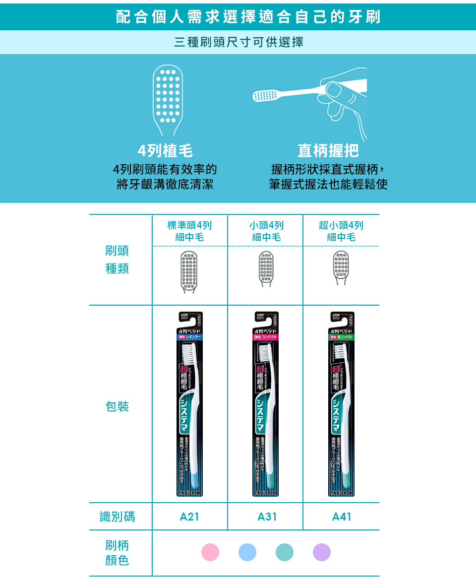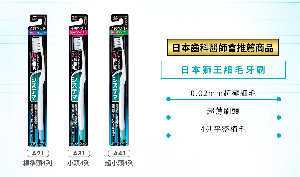 •4列平整植毛,從牙齒到牙齦都能刷及;每根皆是超極細毛,能呵護細嫩牙齦。