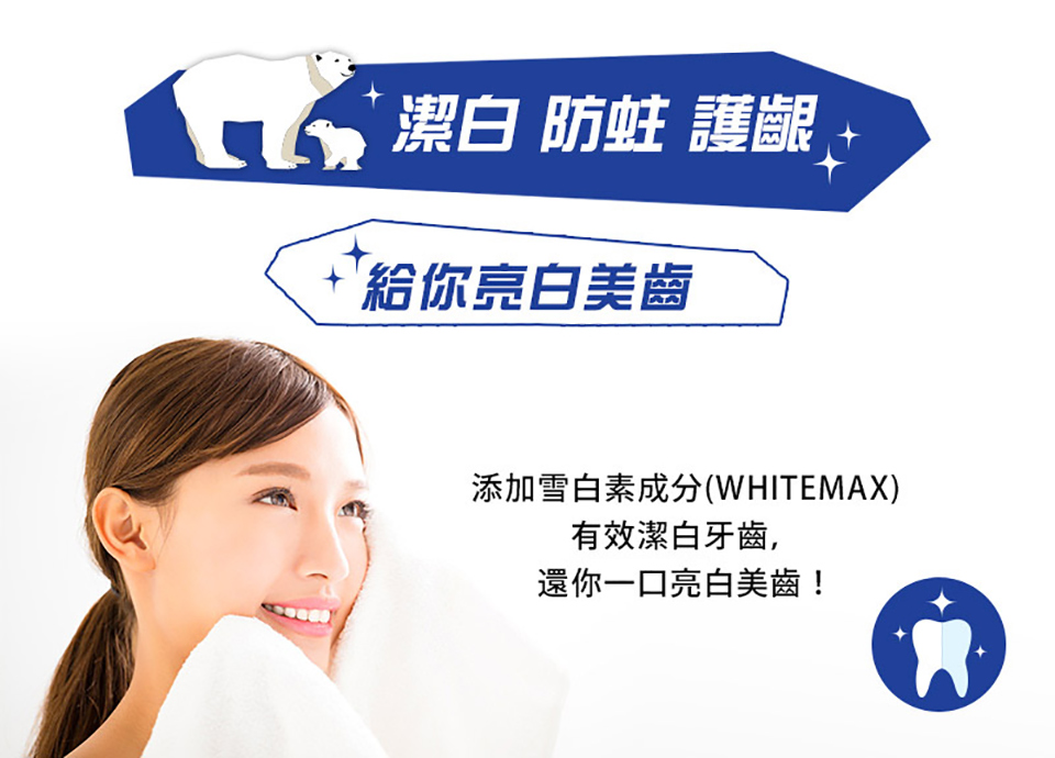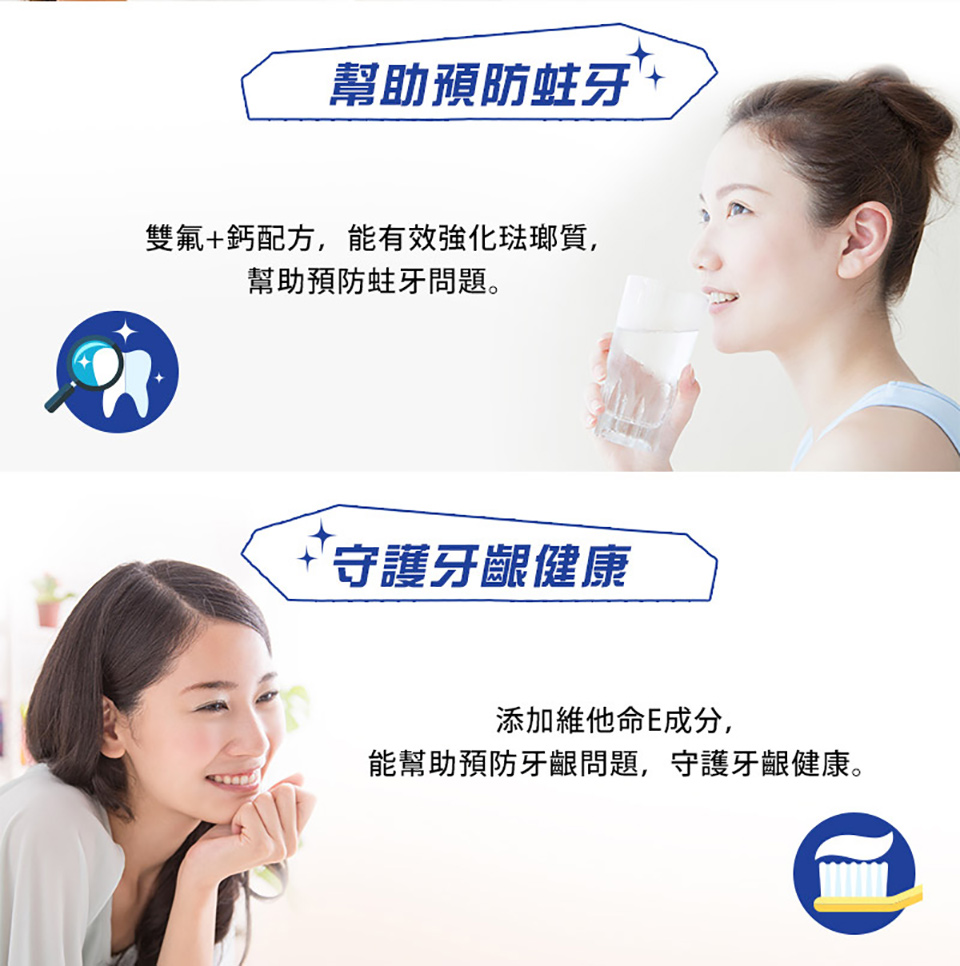 •雙氟+鈣,強化琺瑯質,預防蛀牙。