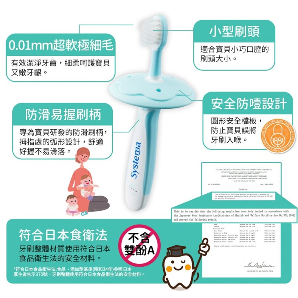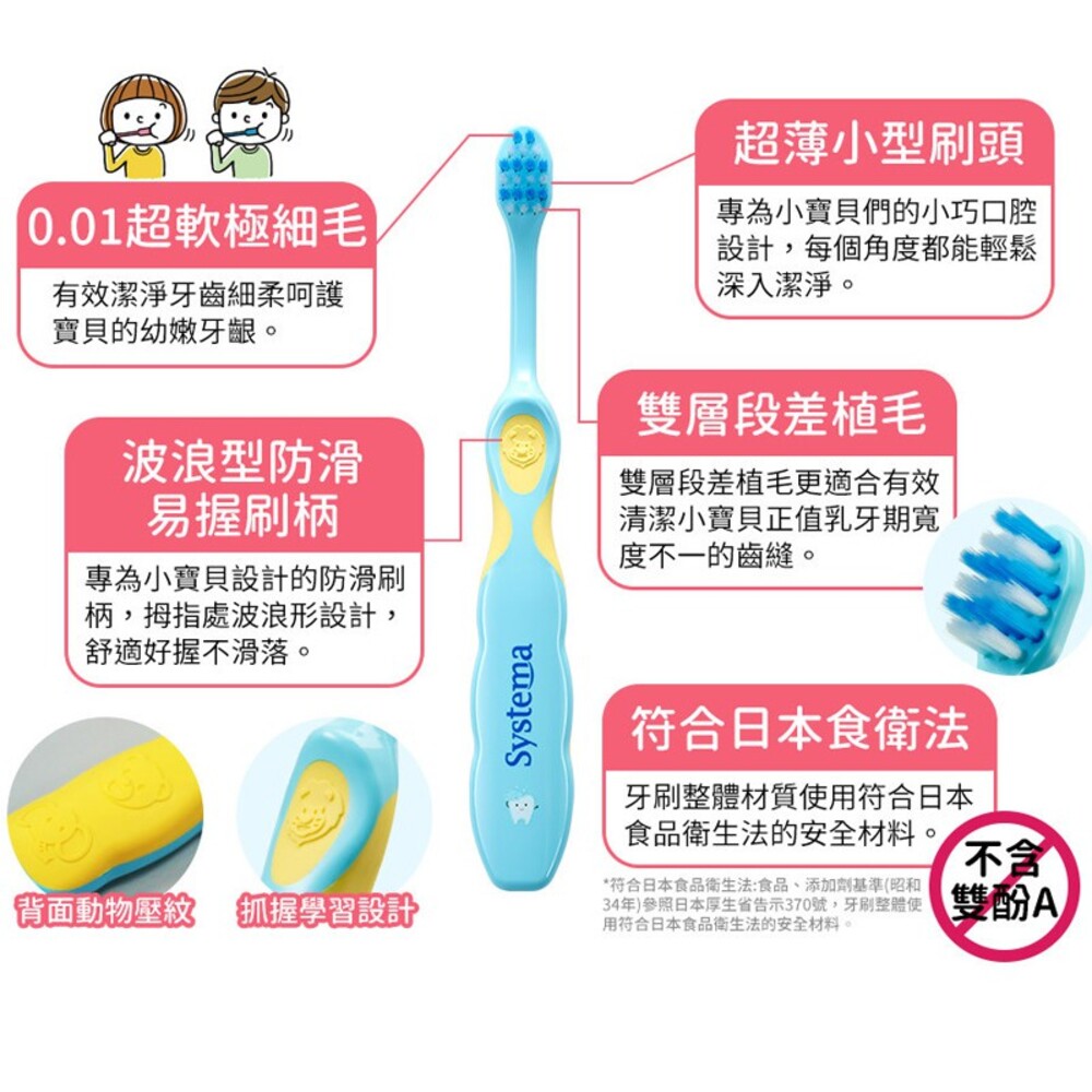 ・0.01超軟極細毛:超軟極細毛,配合迷你刷頭,有效潔淨牙齒,輕柔按摩寶貝細嫩牙齦