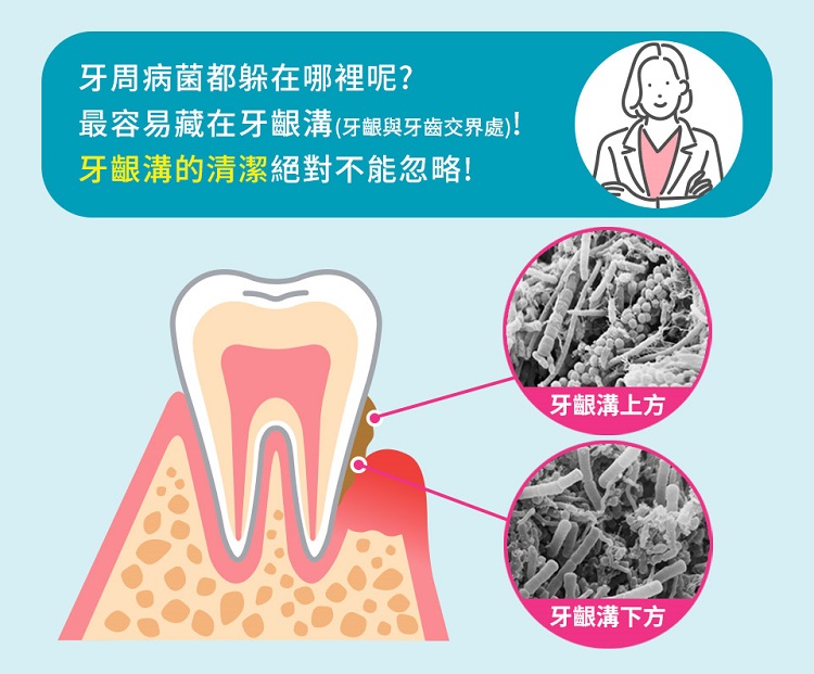 1.山形植毛,淨護牙齦溝:貼合齒齦且深入清潔因牙周問題而變寬的牙齦溝,潔淨效果1.5倍。