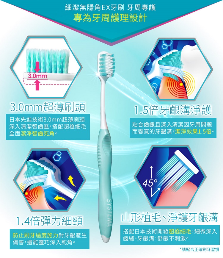 搭配日本技術開發超級細毛,細微深入齒縫、牙齦溝,舒齦不刺激。