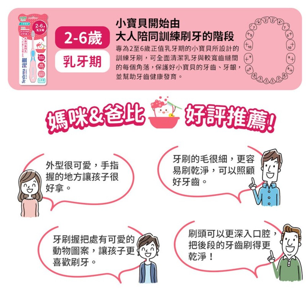 ・0.01超軟極細毛:有效潔淨牙齒,細柔呵護寶貝的幼嫩牙齦。搭配薄型刷頭更精巧好操作。