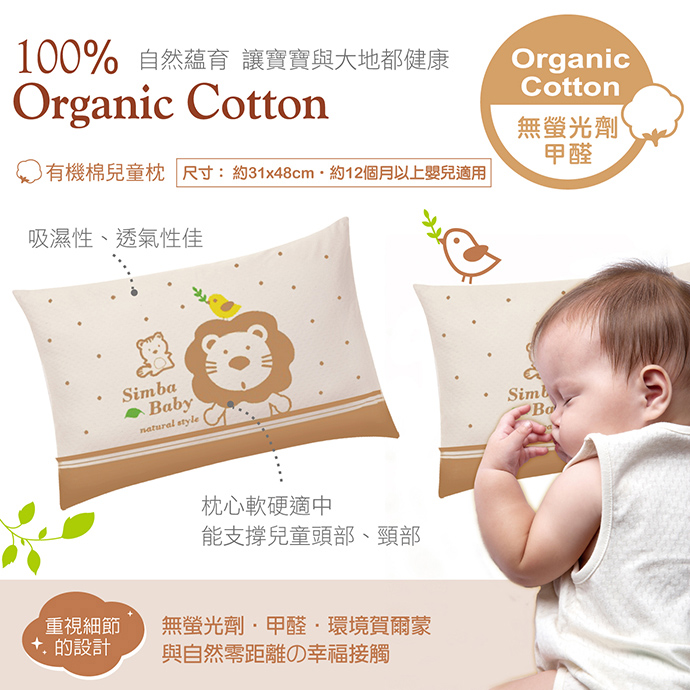 產品特色 1.100%天然有機棉布、通過荷蘭CU國際有機認證。 2.枕心軟硬適中,吸濕性、透氣性佳,能支撐兒童頭部、頸部。 3.可愛辛巴圖案設計、陪伴寶寶入睡。 產品材質 表布:有機棉 100% 填充物:聚脂纖維 100% 尺寸:約31X48cm 產地:台灣製 注意事項:請於大人陪同下使用