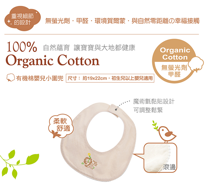 產品特色 1.100%天然有機棉布、通過荷蘭CU國際有機認證。 2.不含螢光劑、甲醛不做任何化學染整,保留原棉色澤。 3.造型滾邊設計,美觀漂亮。 產品材質 表布:有機棉 100% 裡布: 防水布 聚脂纖維 100% 尺寸:約19X22cm 產地:台灣製 注意事項:請在大人陪同下使用