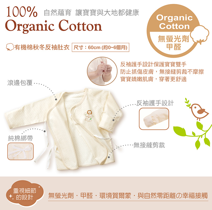 適用年齡:約0~6個月 產品特色: 1.100%天然有機棉布、通過荷蘭CU國際有機認證。 2.不含螢光劑、甲醛不做任何化學染整,保留原棉色澤。 3.無接縫剪裁,不傷寶寶嬌嫩肌膚穿著更舒適。 4.柔軟細緻,反袖護手設計保護寶寶雙手。 產品材質:棉 100% 產地:台灣 產品尺寸:60cm(約0~6個月)
