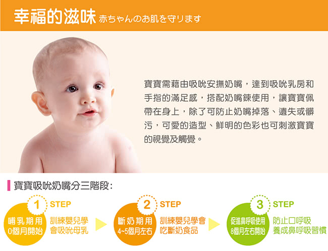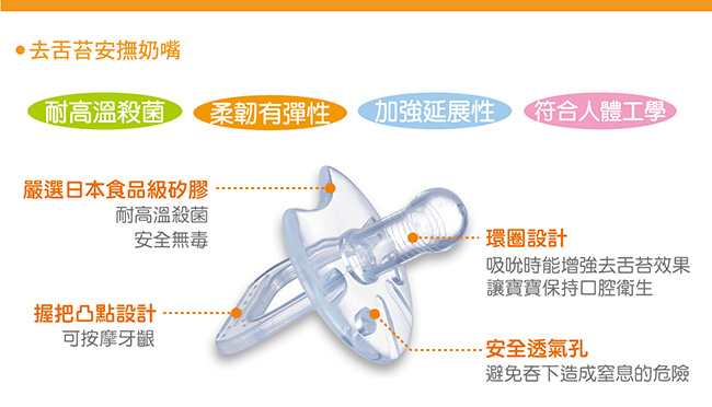 ●產品特色 1.嚴選日本食品級活性矽膠,耐高溫殺菌、安全無毒。 2.奶嘴環圈設計,吸吮時能增強去舌苔效果,讓寶寶保持口腔衛生。 3.握把凸點設計,可按摩牙齦。 ●產品成份 矽膠Silicone (120℃±10)