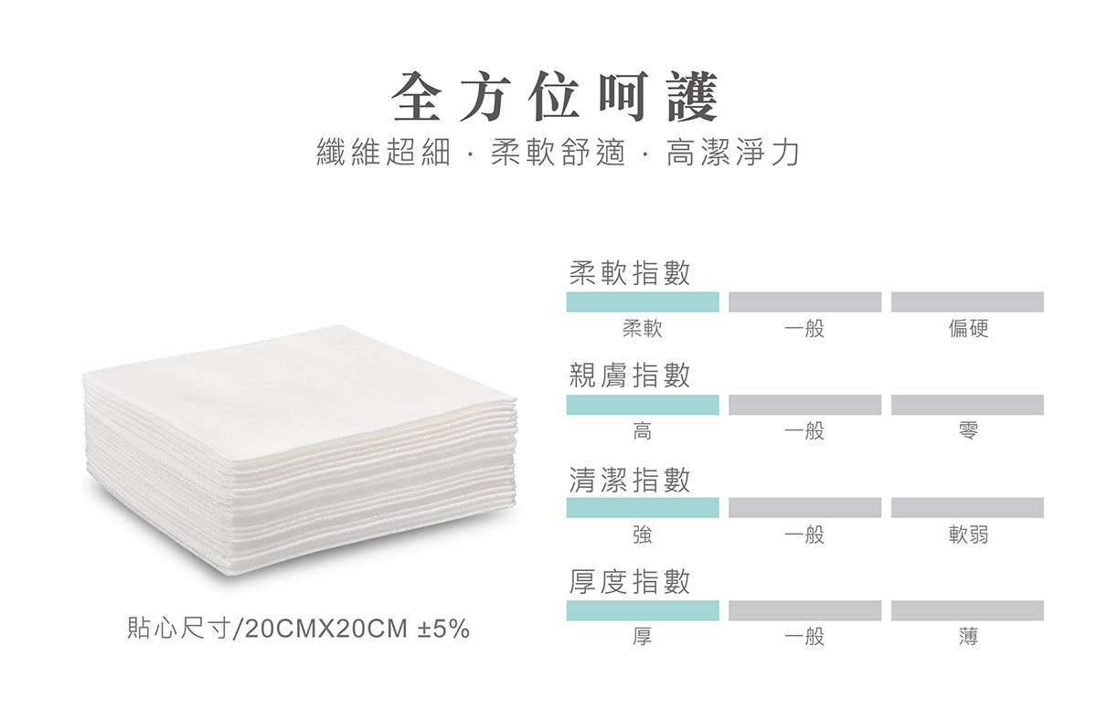 •嚴選加厚嫘縈水針布,質地柔軟細緻,透氣度佳,強韌不易破損,不掉棉絮。