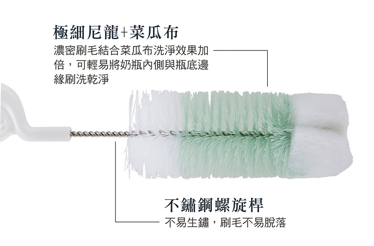•不鏽鋼螺旋桿,不易生鏽,刷毛不易脫落,適合各種大小奶瓶使用。