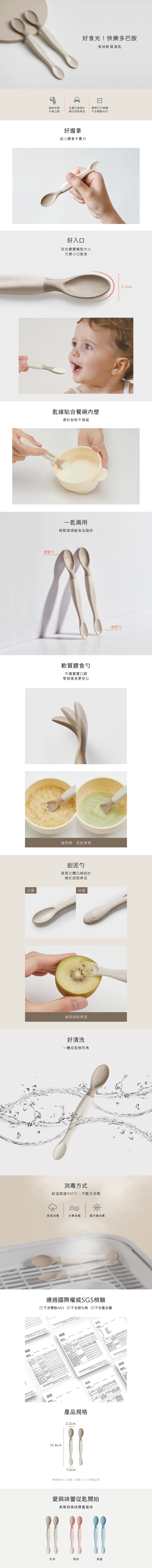 •餵食勺軟質材質,不傷寶寶口腔,學習進食更安心。