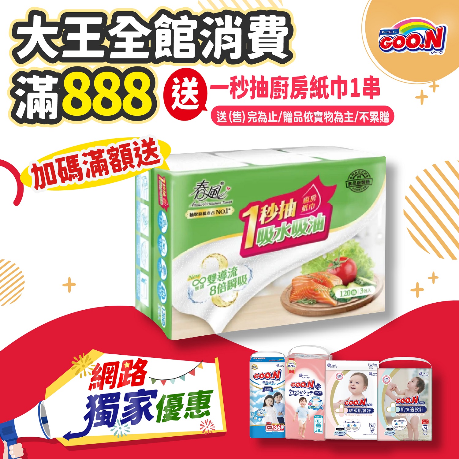 【網路獨家優惠】大王全館消費滿888元,再送一秒抽廚房紙巾1串(送完為止/不累贈)