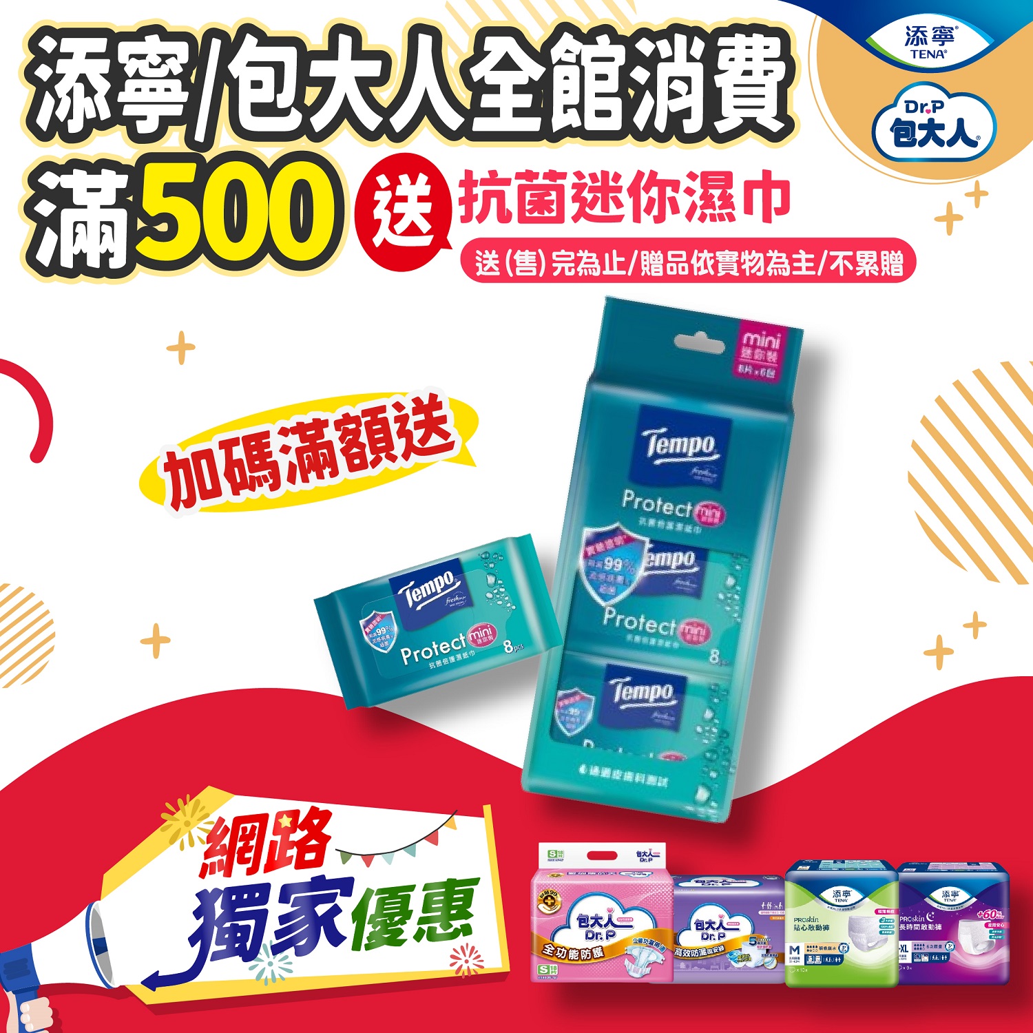 【網路獨家優惠】添寧/包大人全館消費滿500 送抗菌迷你濕巾8抽(送完為止/不累贈)