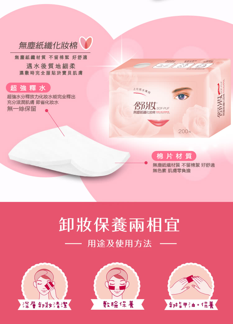 用途:上化妝水、敷臉、卸妝、去除指甲油…等