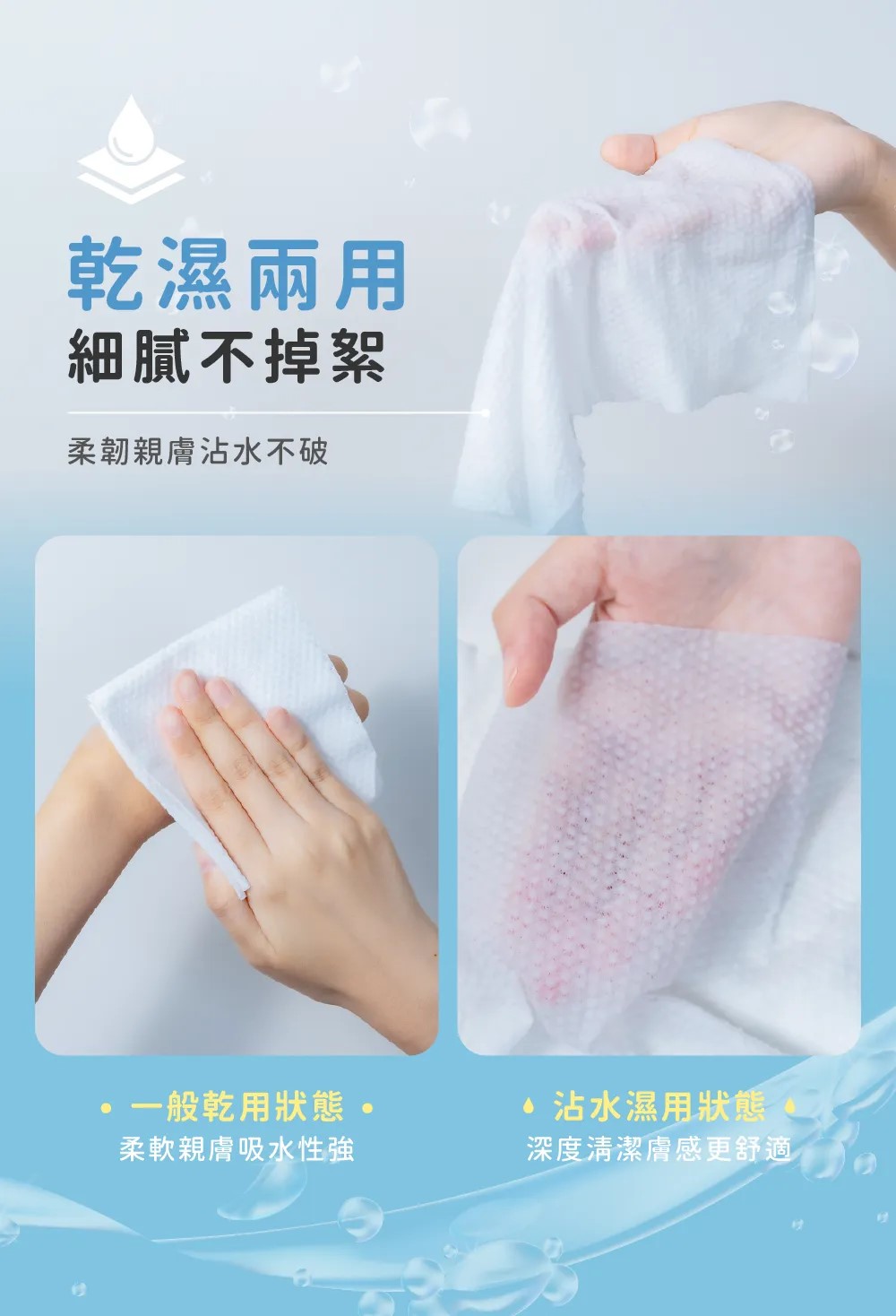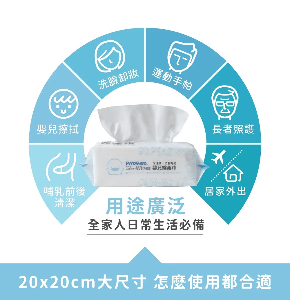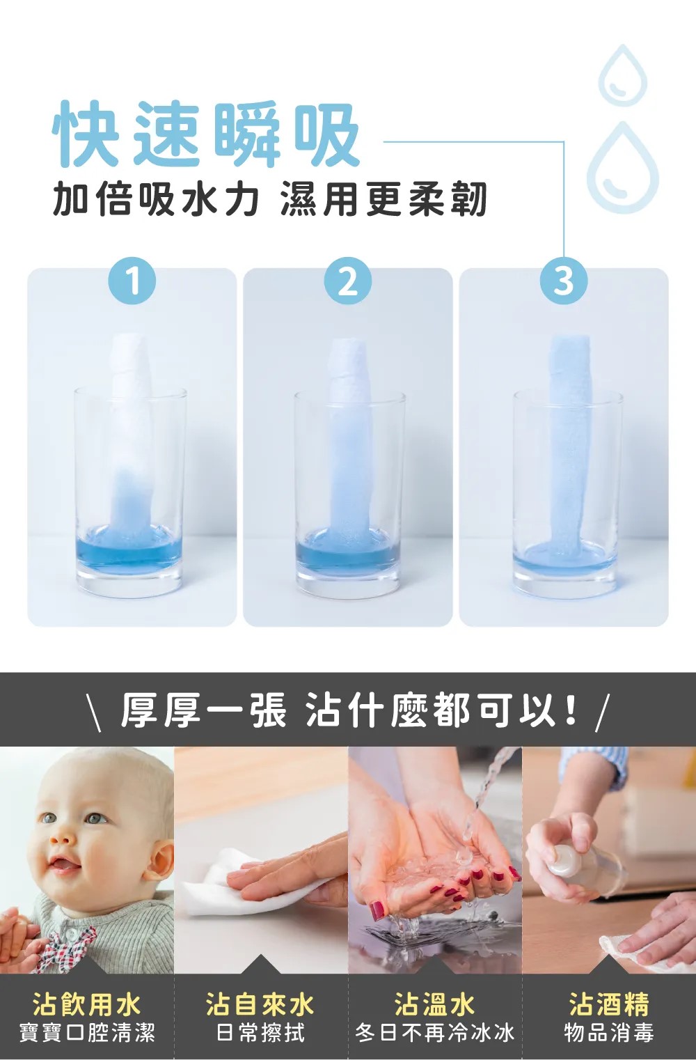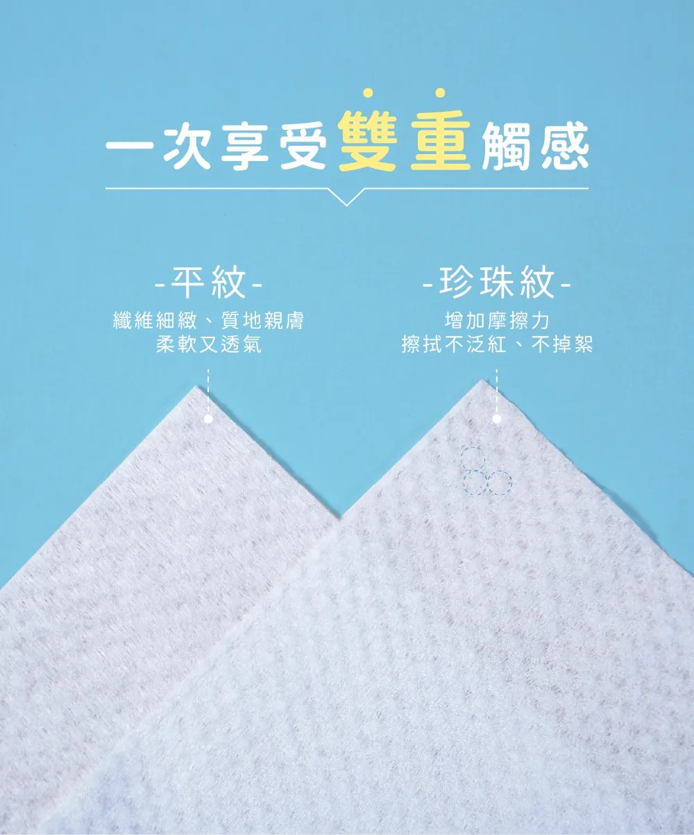 •乾濕兩用沾水瞬吸,耳、鼻、口、身擦拭都安心。