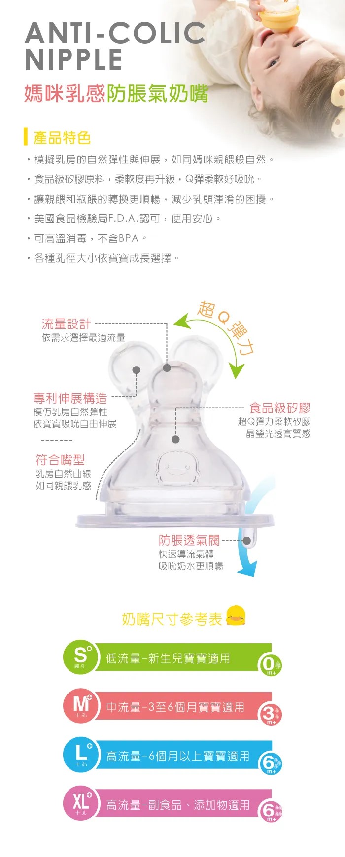 •奶嘴模擬媽咪乳感的自然彈性與伸展,如同媽咪親餵般自然。