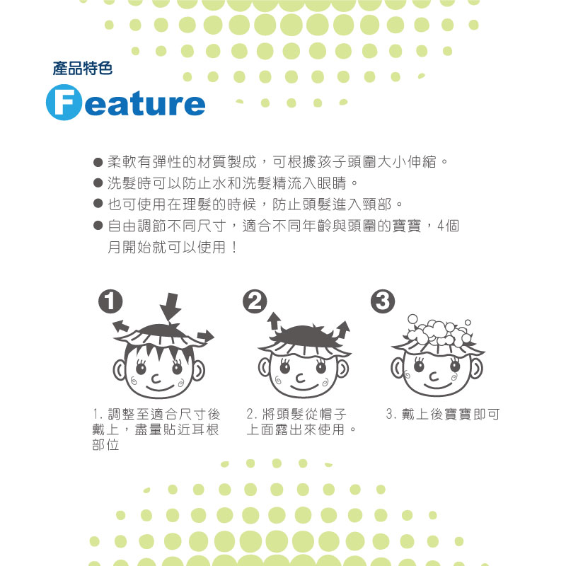 •柔軟有彈性的材質製成,可根據孩子頭圍大小伸縮洗髮時可以防止水和洗髮精流入眼睛。