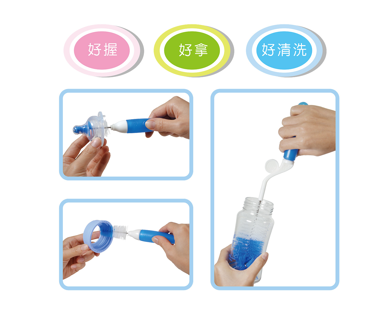 1.將奶瓶刷或奶嘴刷放入奶瓶或奶嘴內,360度旋轉刷洗,即可輕鬆清洗奶瓶。
