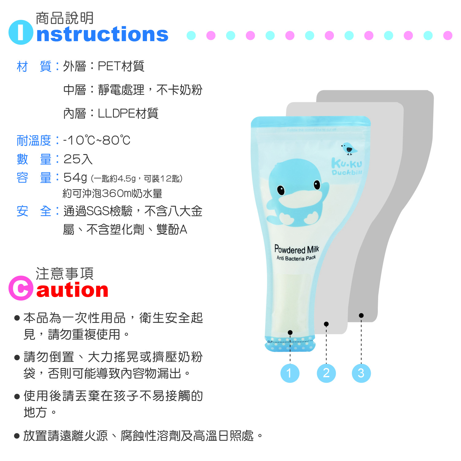 注意事項/保存方式:本產品為一次性用品,衛生安全起見,請勿重複使用。請勿倒置、大力搖晃或擠壓袋體,否則可能導致內容物漏出。使用後請丟棄在孩子不易接觸的地方。放置請遠離火源、腐蝕性溶劑及高溫日照處。