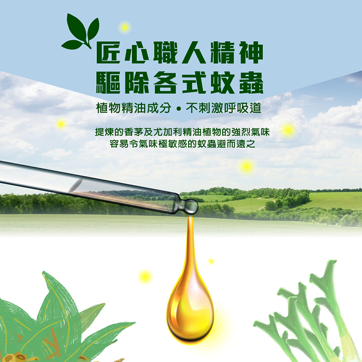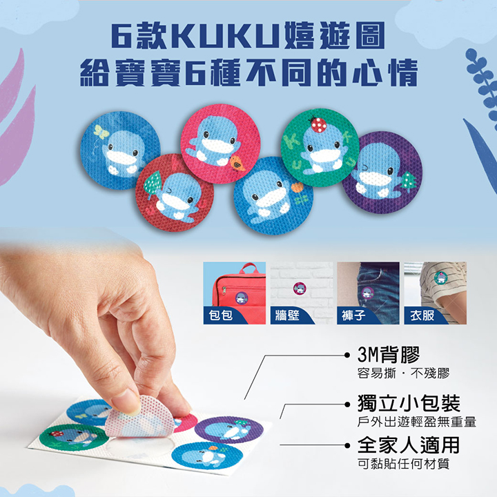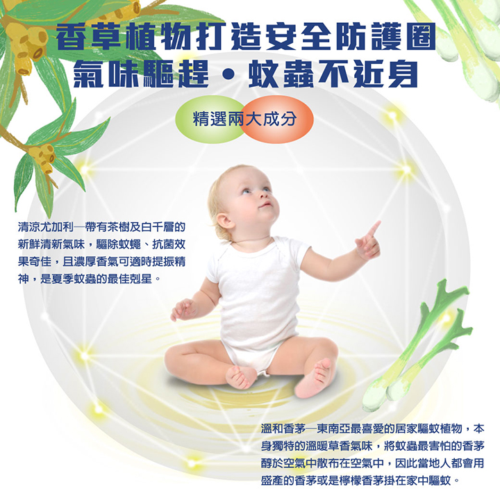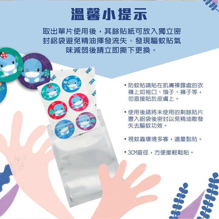 產品規格:直徑3cm x 6枚入鋁袋包 主要成份:香茅精油、尤加利精油、植物性配方。適用年齡:全家適用材質:高密度無紡布、背膠。 數量:12枚入 產地 : 台灣 使用方法:撕開鋁袋外包裝,將產品黏貼於衣物、褲子、鞋子、帽子、包包等物品上。 精油揮發室內約24小時、戶外約8小時。 本產品未含樟腦丸成分,蠶豆症者請諮詢醫生後再使用。