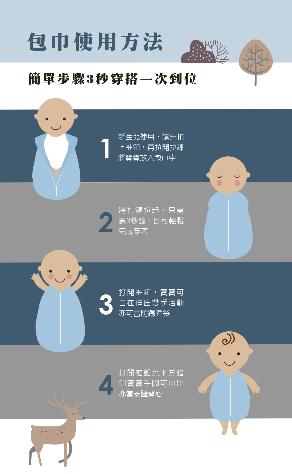 1.新生兒使用,請先扣上袖釦,再拉開拉鍊將寶寶放入包巾中