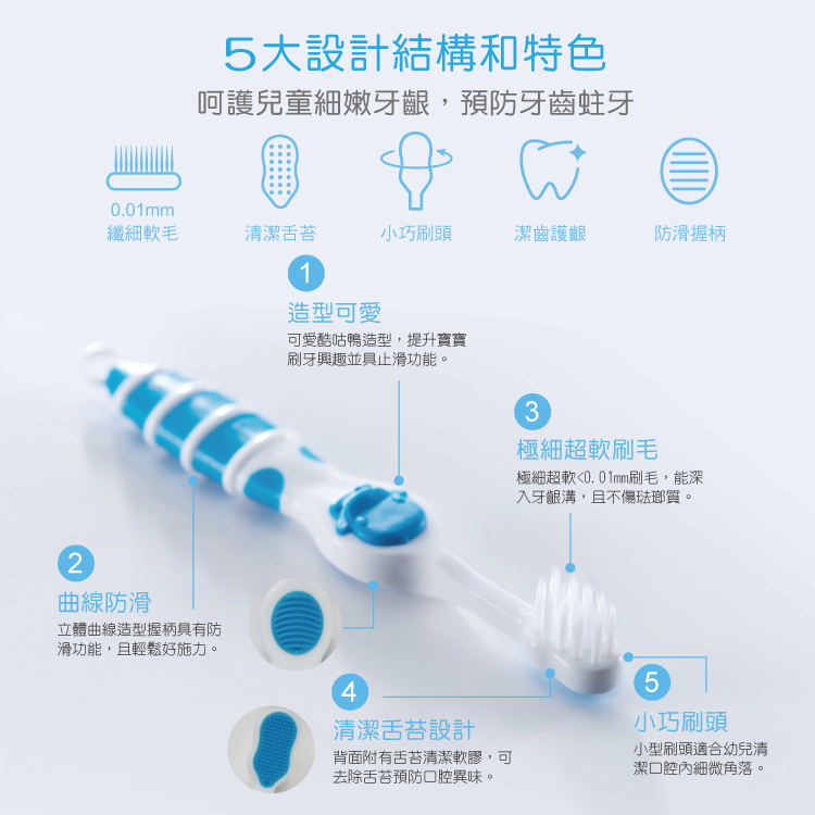 酷咕鴨可愛造型握把,想受KUKU帶來的刷牙樂趣,極細超軟刷毛,加倍呵護口腔。