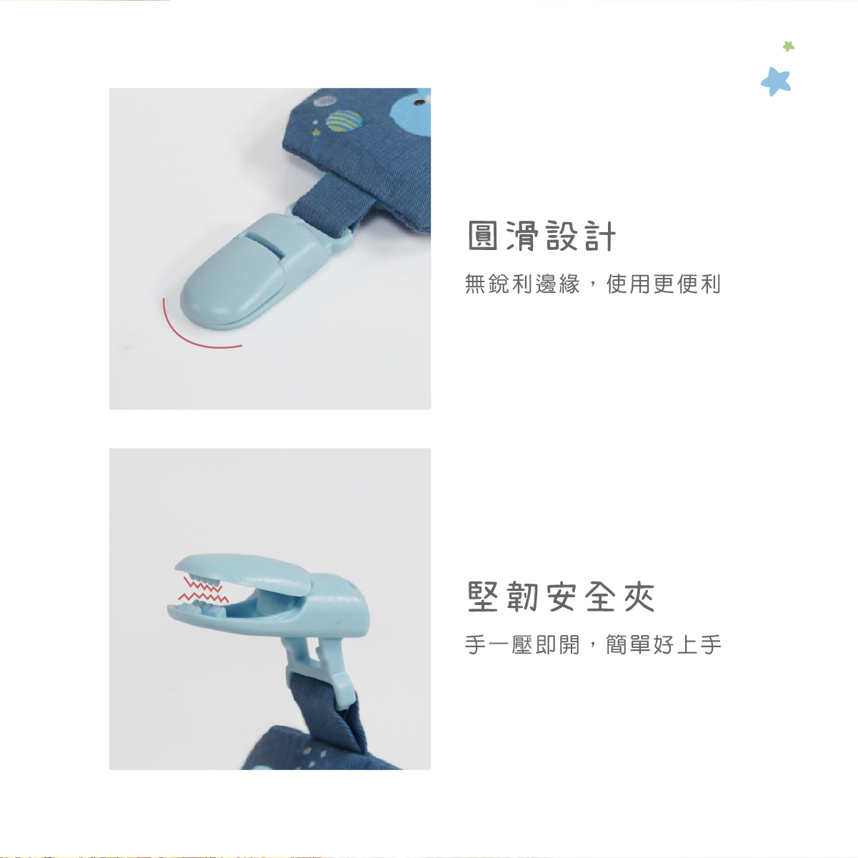 •堅韌安全夾,手一壓即開,簡單好上手。