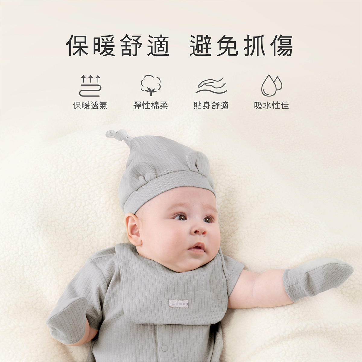 以大地色羅紋針織設計,精選6x1羅紋布,以雙面緯編針織技術製成,展現出肋骨般的直線織紋。具優良延伸彈性與收縮回復性,穿著舒適且耐用,結合竹纖維與精梳棉,吸濕透氣、排汗抗臭,天然無毒並具環保認證,給寶寶舒適健康的高質感選擇
