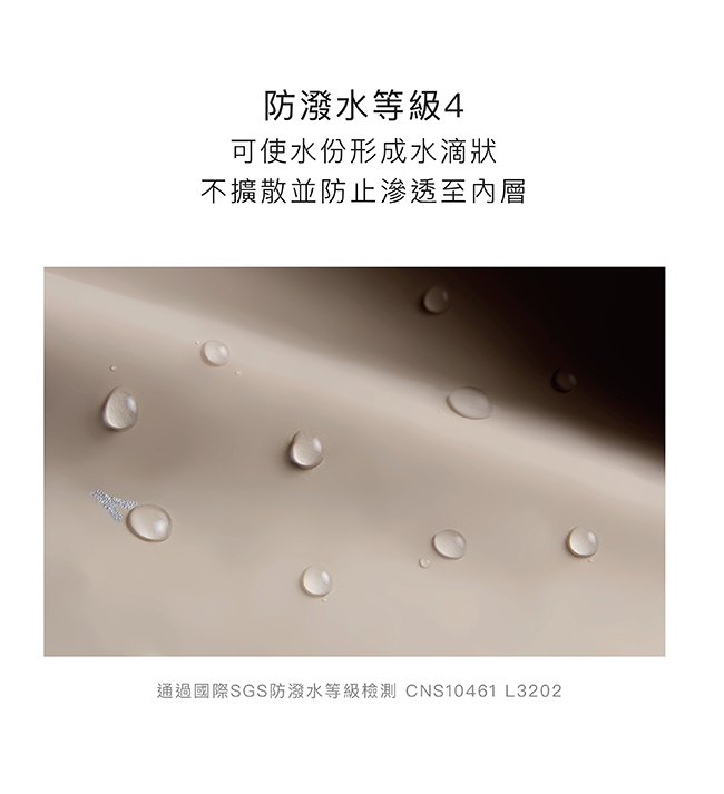 •通過國際SGS防潑水等級檢測,防潑水等級4,可使水份形成水滴狀,防止滲透至內層。