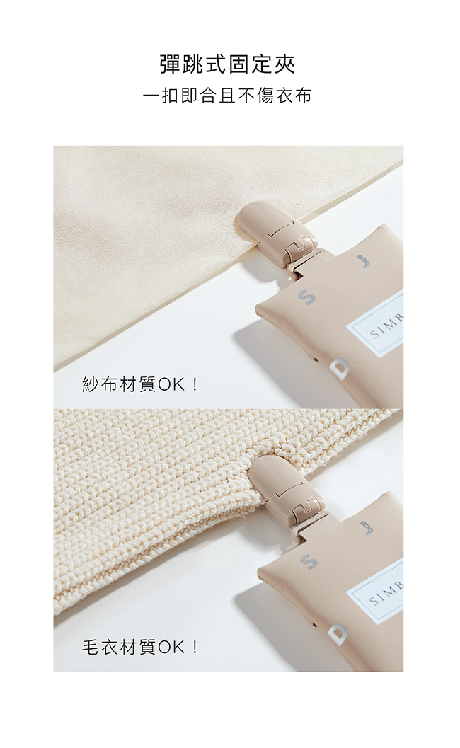 •彈跳式固定夾,一扣即合且不傷衣布,厚薄衣物都能穩穩夾住。