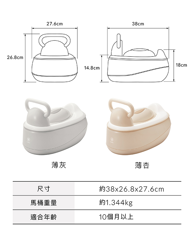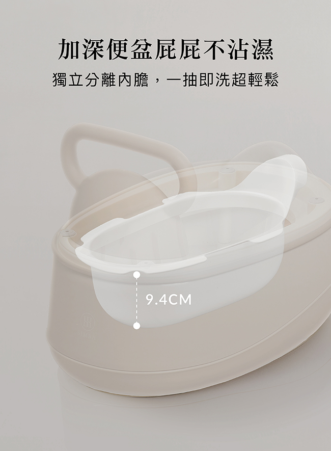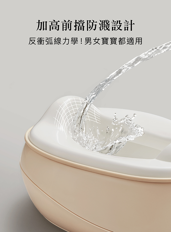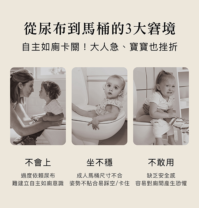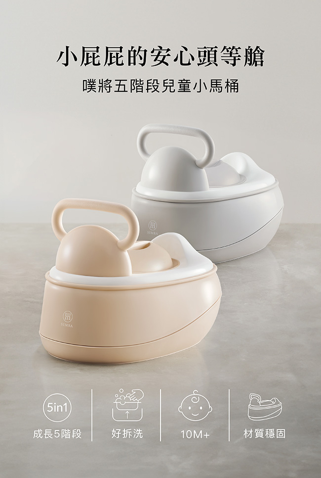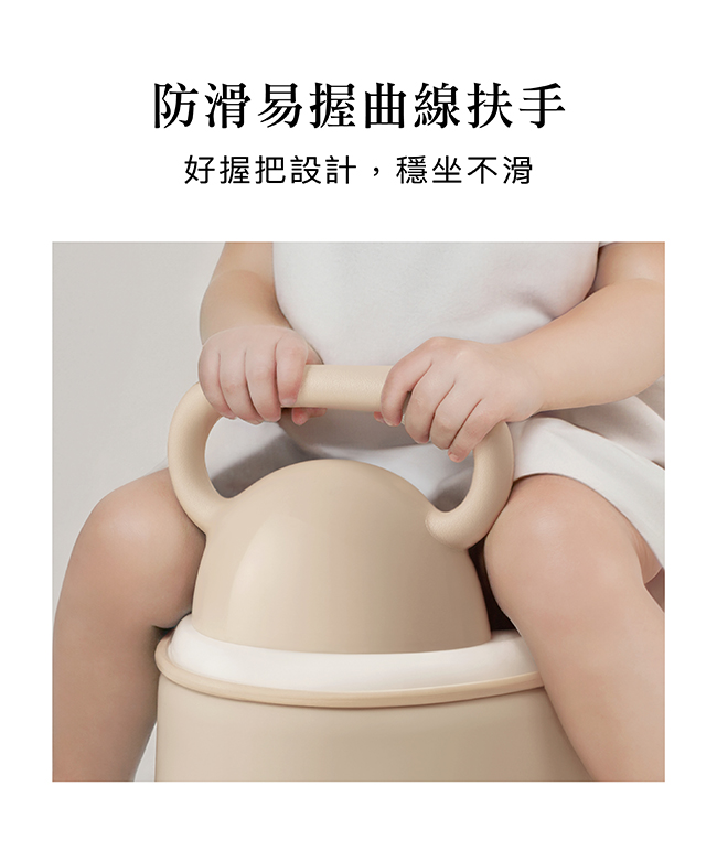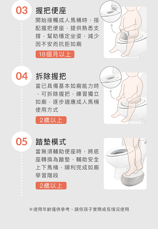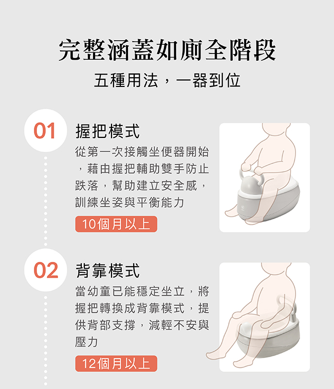 •多功能五階段設計,從穩坐訓練、如廁練習,到過渡使用成人馬桶,一桶陪伴成長期