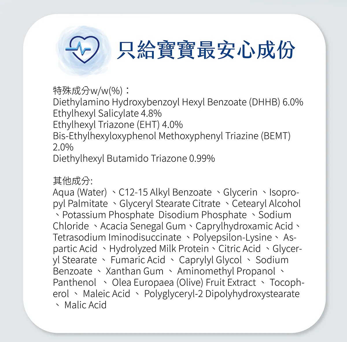 獨特的UV過濾防曬科技,全方位抵禦紫外線UVA及UVB,安全防護寶寶肌膚。