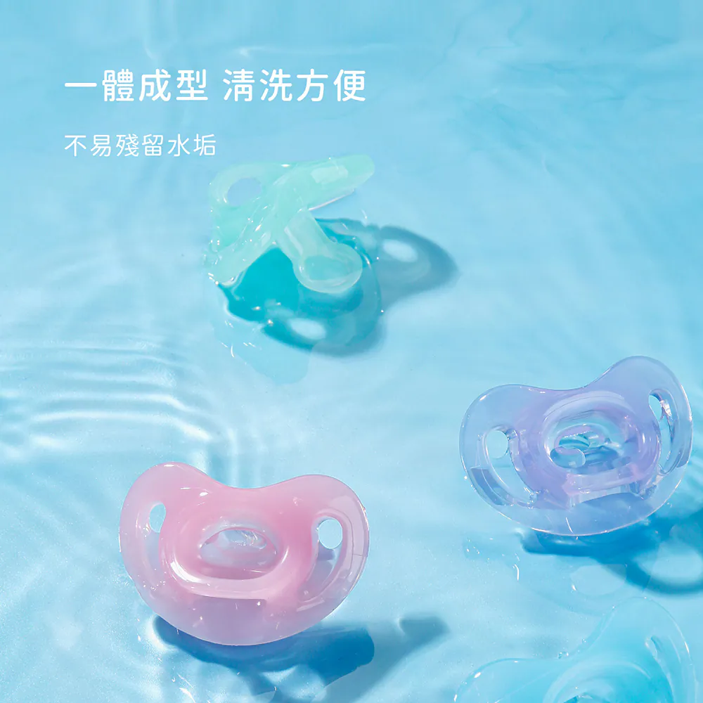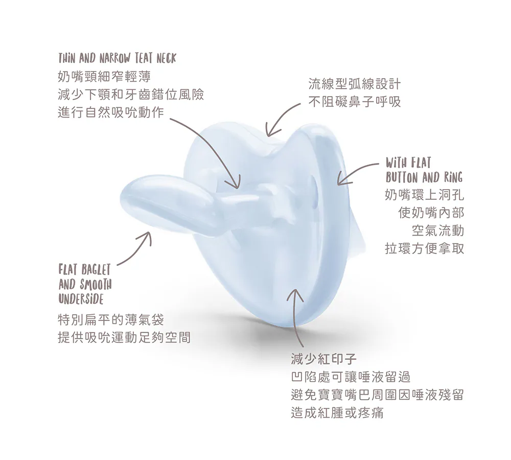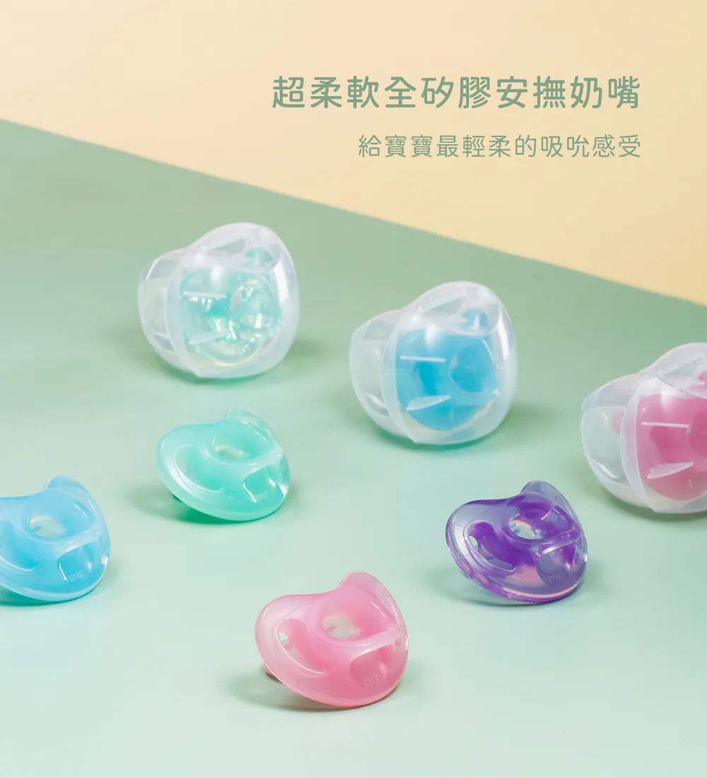 超柔軟全矽膠軟板設計,特別適合嬌嫩敏感的新生兒皮膚,德國牙醫學專家研發推薦,仿母乳拇指型奶嘴設計訓練寶寶吸吮,減少齒列不正風險,滿足口慾期安撫需求,不含雙酚A,貼心附防塵儲存盒,給寶寶最輕柔的吸吮感受