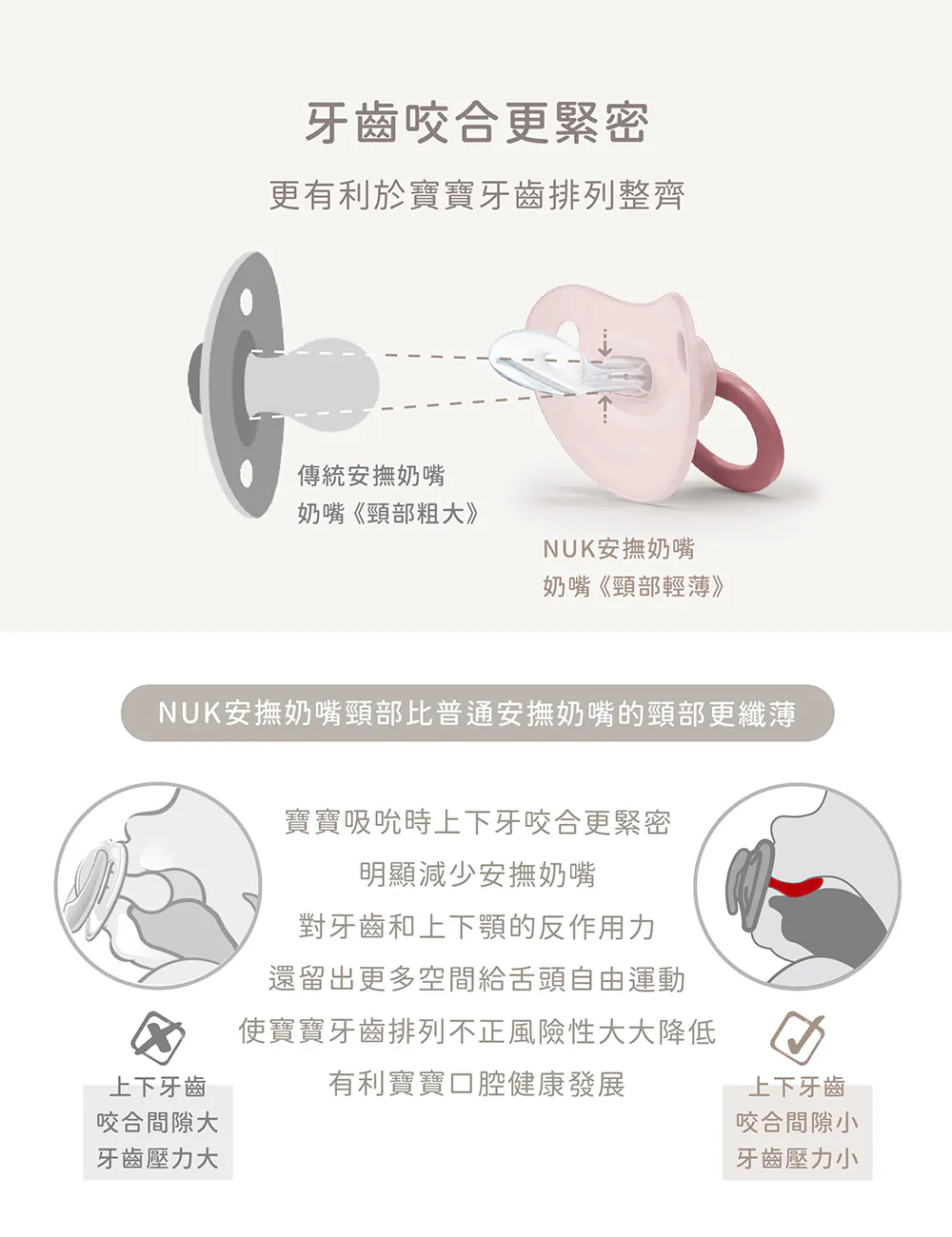 •凹型舌端細窄頸部,減少齒列不正風險