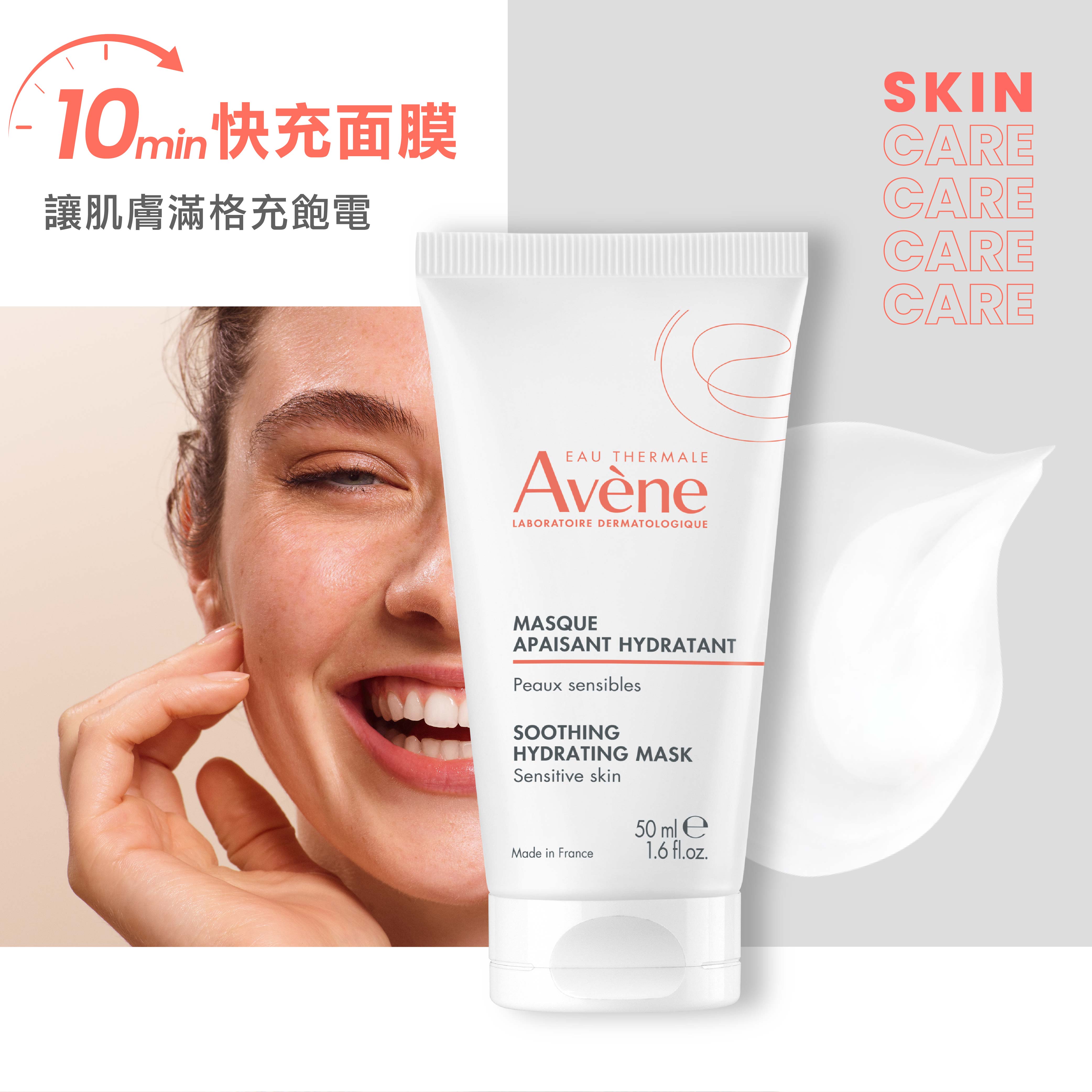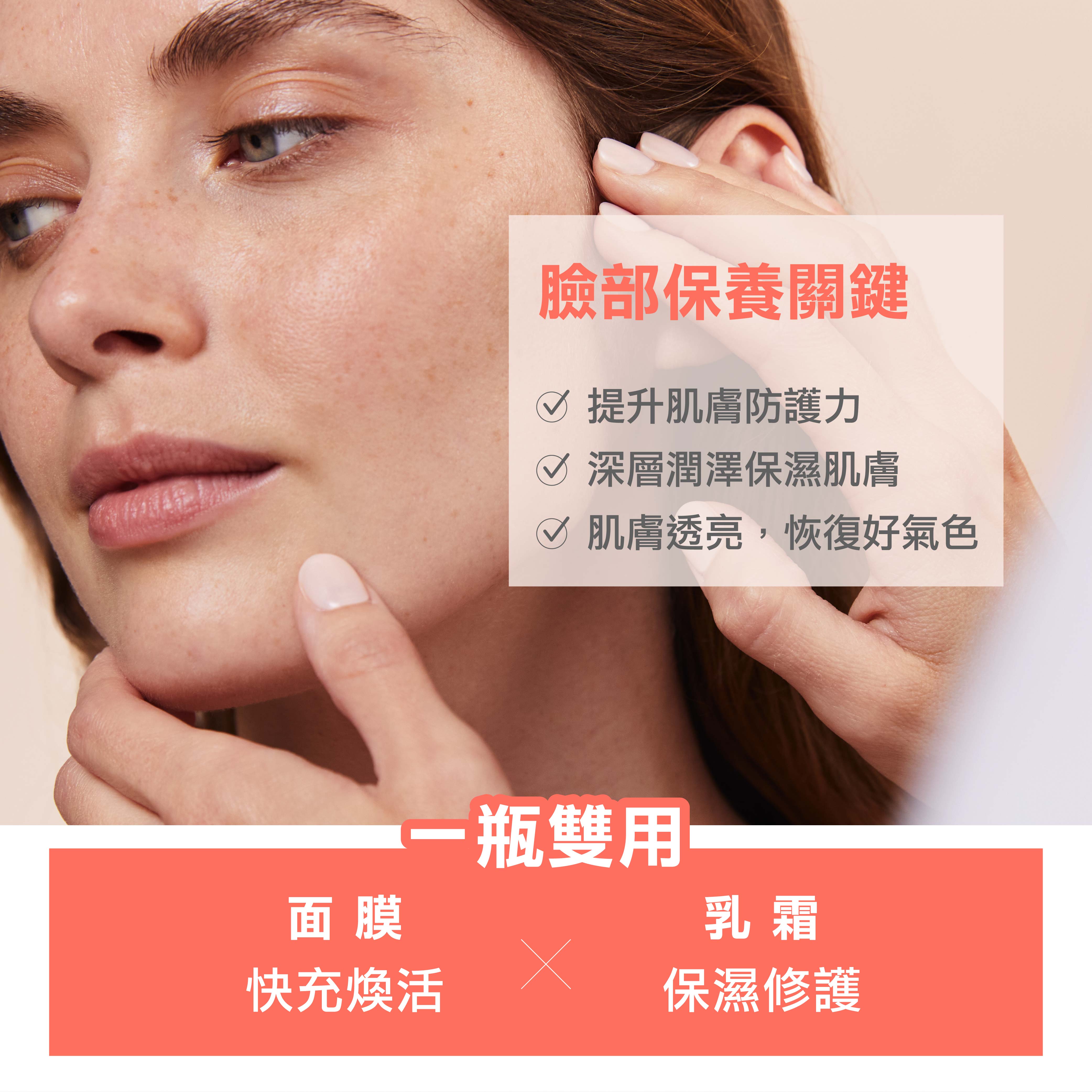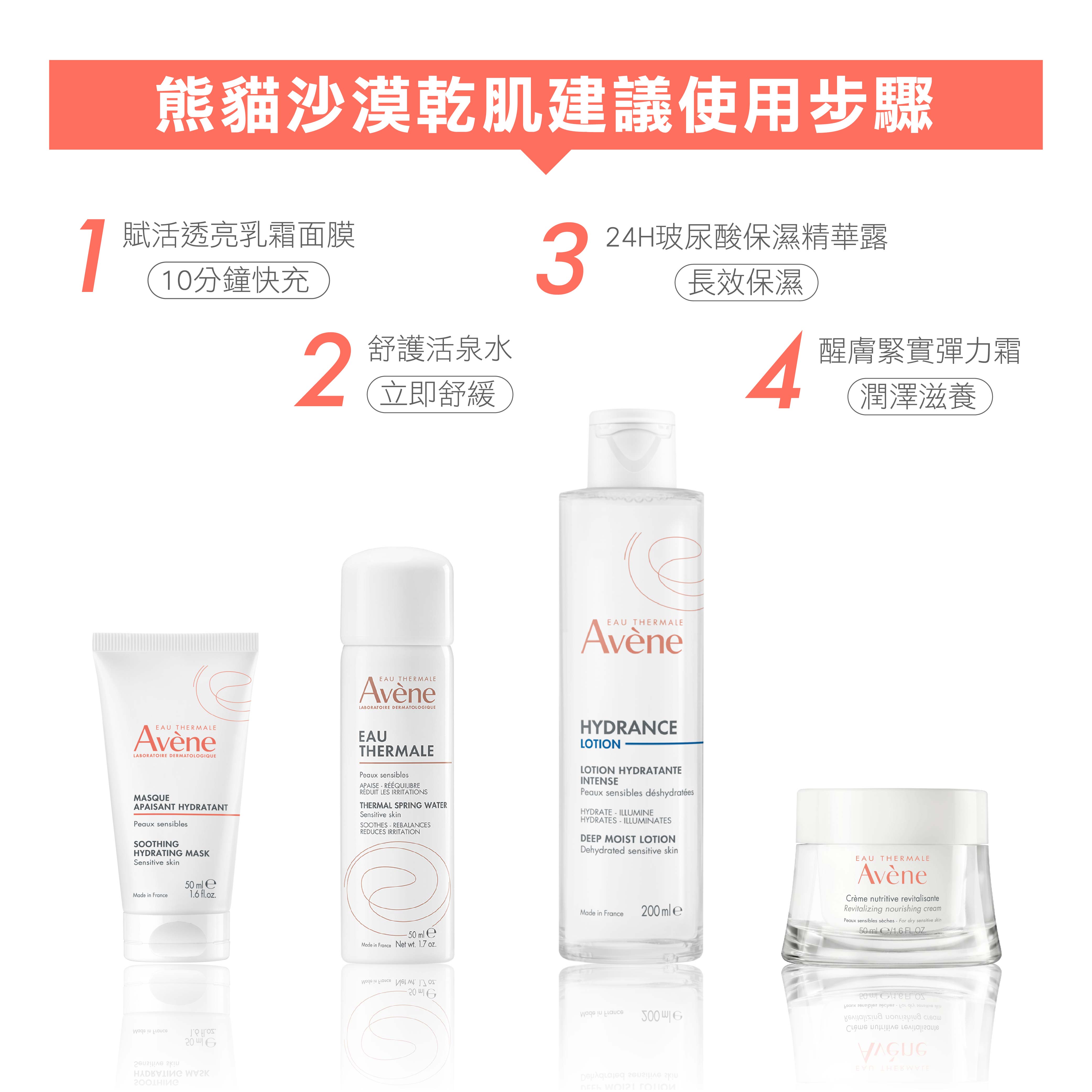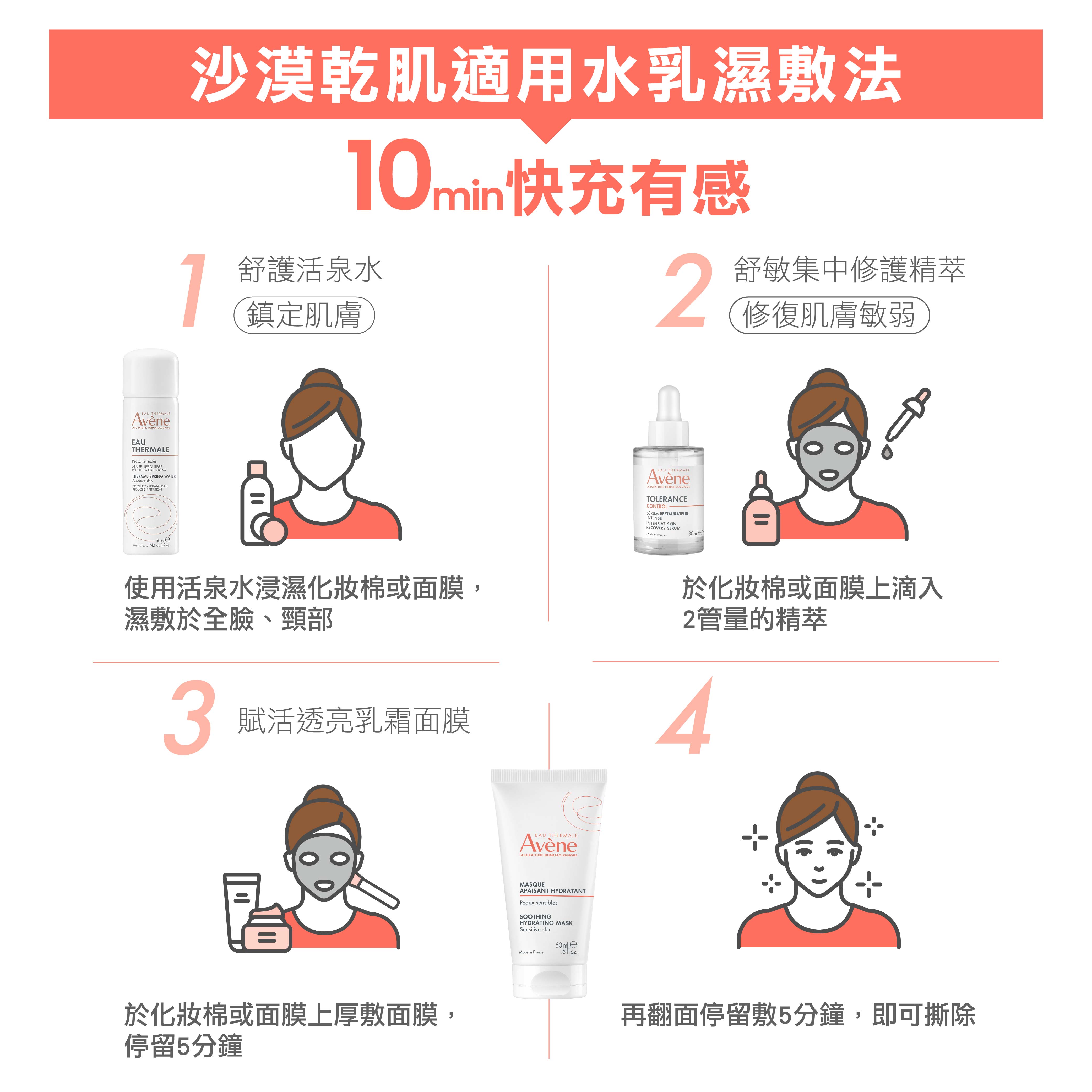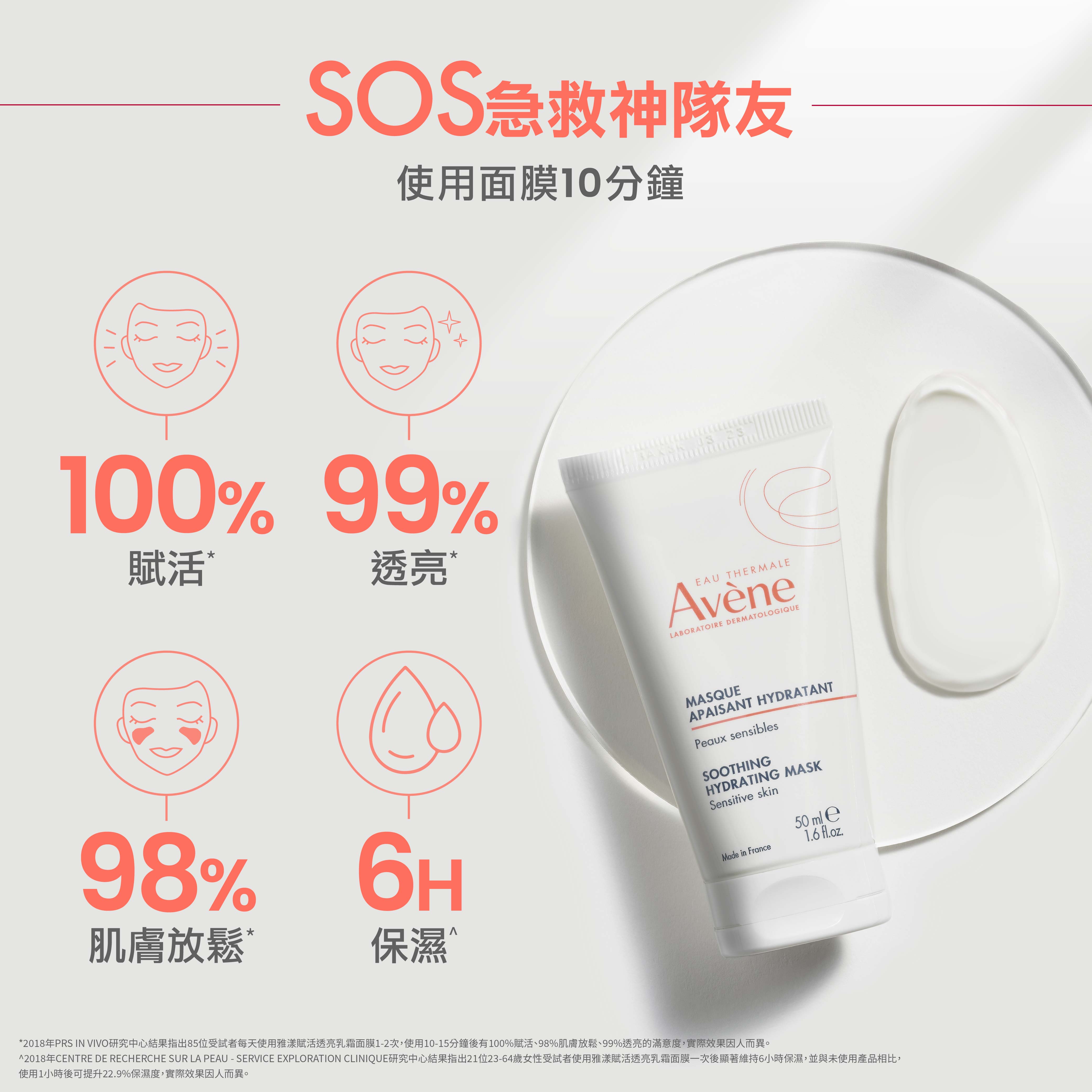 •SOS快速舒緩乾燥:含舒護活泉水、紅花籽油,使用10分鐘,即時舒緩乾燥不適,深層潤澤保濕,讓肌膚滿格充飽電