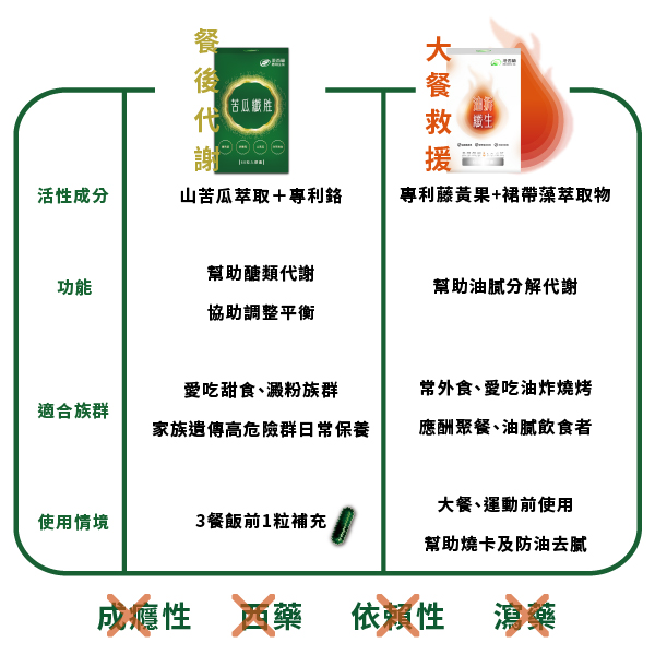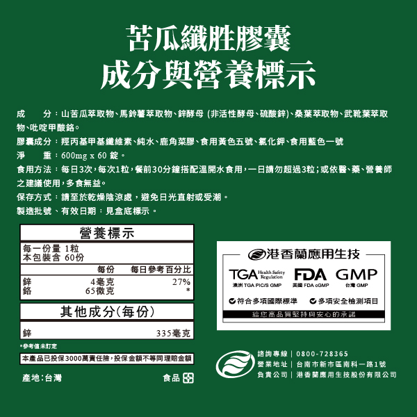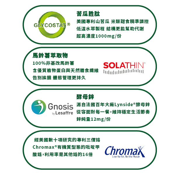 山苦瓜萃取物、馬鈴薯萃取物、鋅酵母 (非活性酵母、硫酸鋅)、桑葉萃取物、武靴葉萃取物、吡啶甲酸鉻