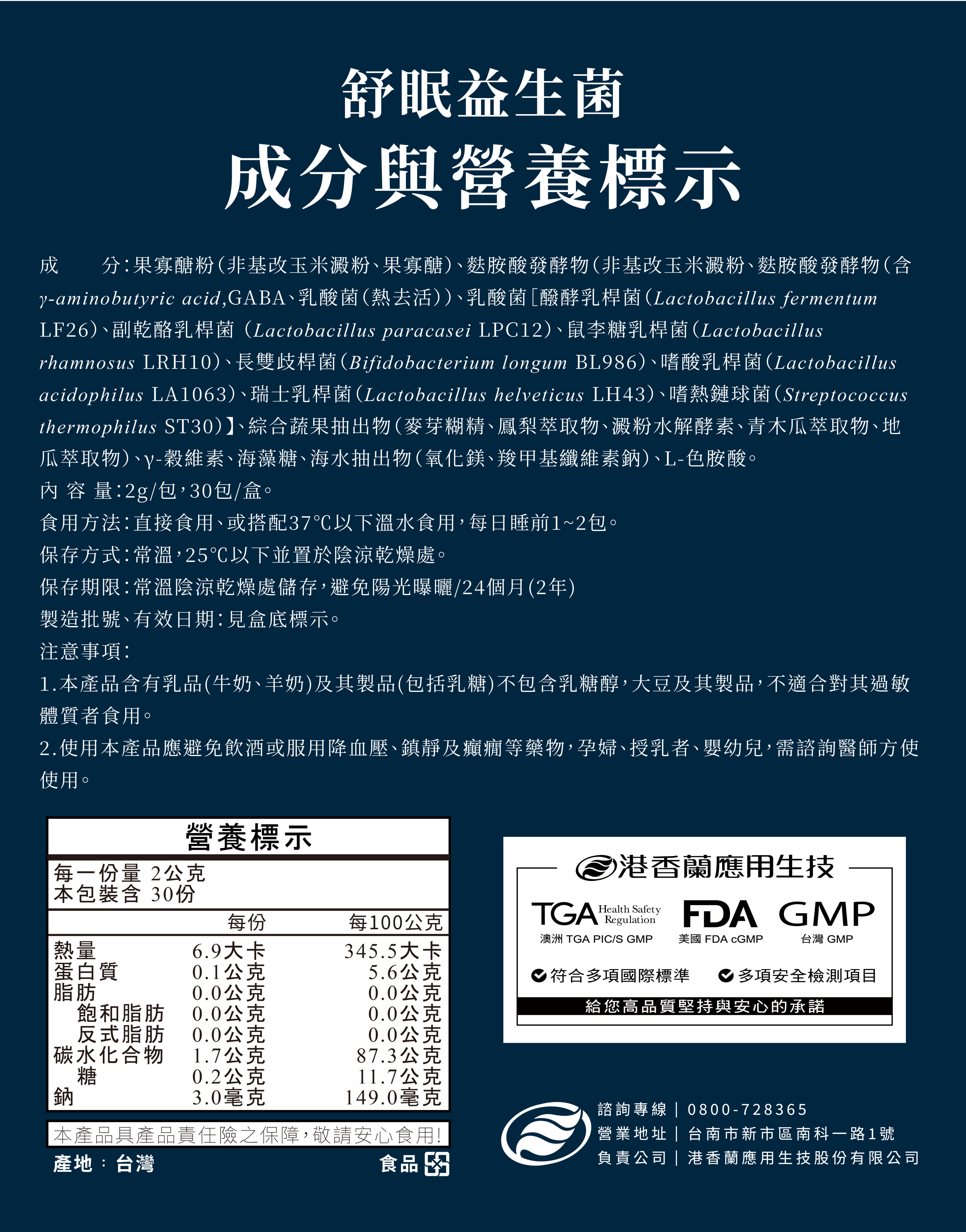 果寡醣粉(非基改玉米澱粉、果寡醣)、麩胺酸發酵物(非基改玉米澱粉、麩胺酸發酵物(含 γ-aminobutyric acid,GABA、乳酸菌(熱去活))、乳酸菌[醱酵乳桿菌(Lactobacillus fermentum LF26)、副乾酪乳桿菌 (Lactobacillus paracasei LPC12)、鼠李糖乳桿菌(Lactobacillus rhamnosus LRH10)、長雙歧桿菌(Bifidobacterium longum BL986)、嗜酸乳桿菌(Lactobacillus acidophilus LA1063)、瑞士乳桿菌(Lactobacillus helveticus LH43)、嗜熱鏈球菌(Streptococcus thermophilus ST30)】、綜合蔬果抽出物(麥芽糊精、鳳梨萃取物、澱粉水解酵素、青木瓜萃取物、地瓜萃取物)、γ-穀維素、海藻糖、海水抽出物(氧化鎂、羧甲基纖維素鈉)、L-色胺酸。
