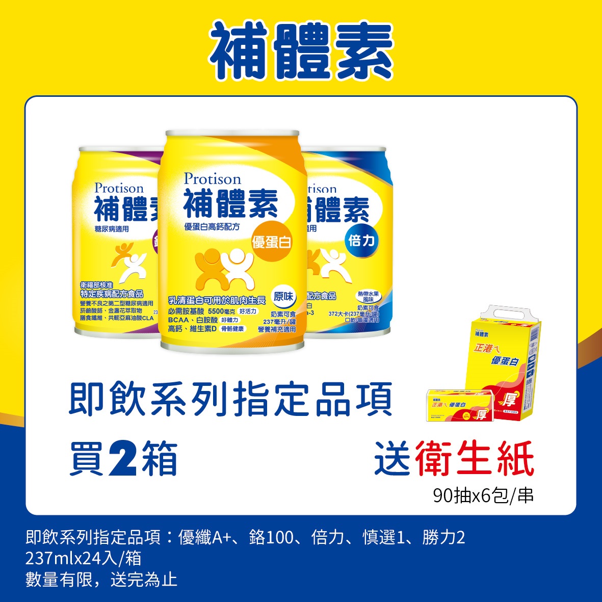 補體素指定水劑,買2箱送衛生紙1串,送完為止