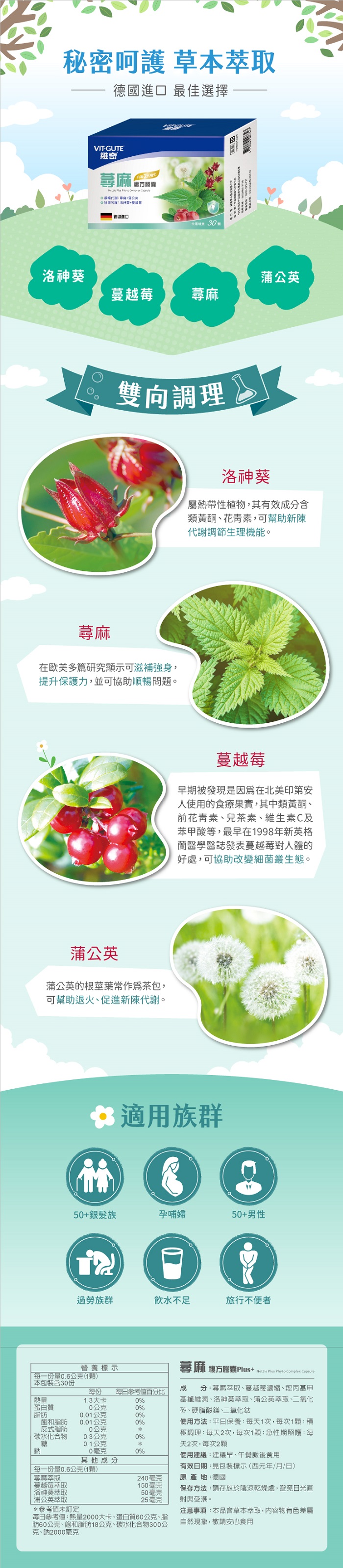 •促進順暢自在:蕁麻萃取+蒲公英萃取