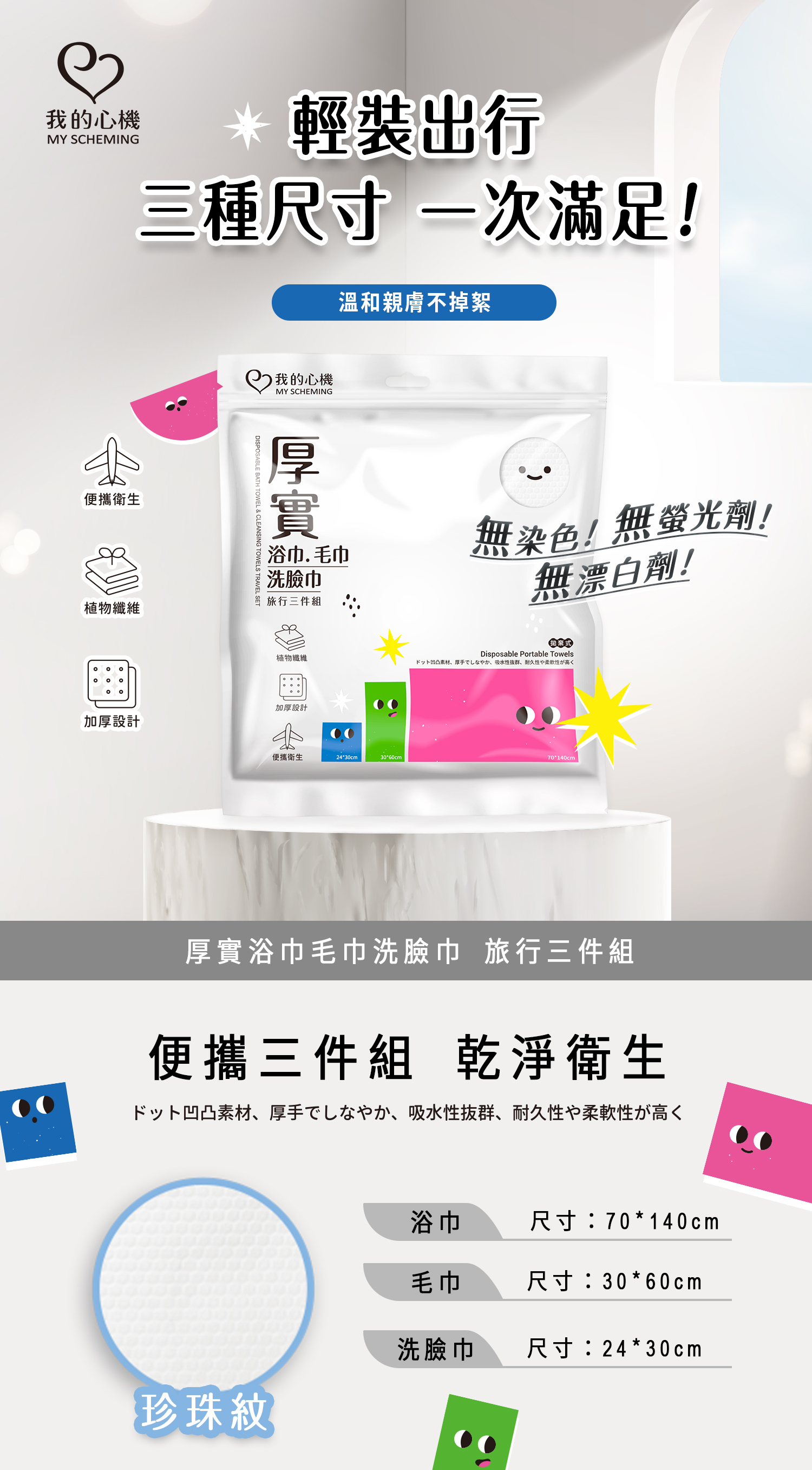 商品注意事項: 1.製造日期與有效期限,商品成分與適用注意事項皆標示於包裝或產品中。 2.產品網頁會因拍攝關係,圖檔/顏色略有差異,實際請以廠商出貨商品實物為主。 3.產品圖及文案若有變動,敬請參照實際商品為準 材質:珍珠紋水織布 產地:中國