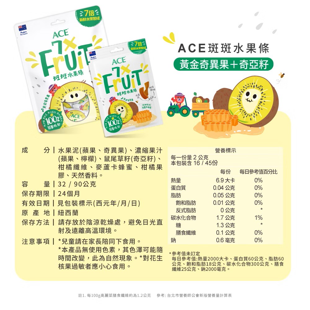 品名:ACE斑斑水果條32g& 90g /袋奇異果+奇亞籽 總保存期限:總保存期限:24個月(實際效期依商品標示為準) 原產地:紐西蘭 保存方法:請存放於陰涼乾燥處,避免日光直射及遠離高溫環境。 注意事項: 1.兒童請在家長陪同下食用。 2.吞嚥困難者請小心食用。 3.對花生核果過敏者應小心食用。 成分: ACE斑斑水果條(奇異果+奇亞籽)_水果泥(蘋果、奇異果)、濃縮果汁(蘋果、檸檬)、鼠尾草籽(奇亞籽)、柑橘纖維、麥蘆卡蜂蜜、柑橘果膠、天然香料