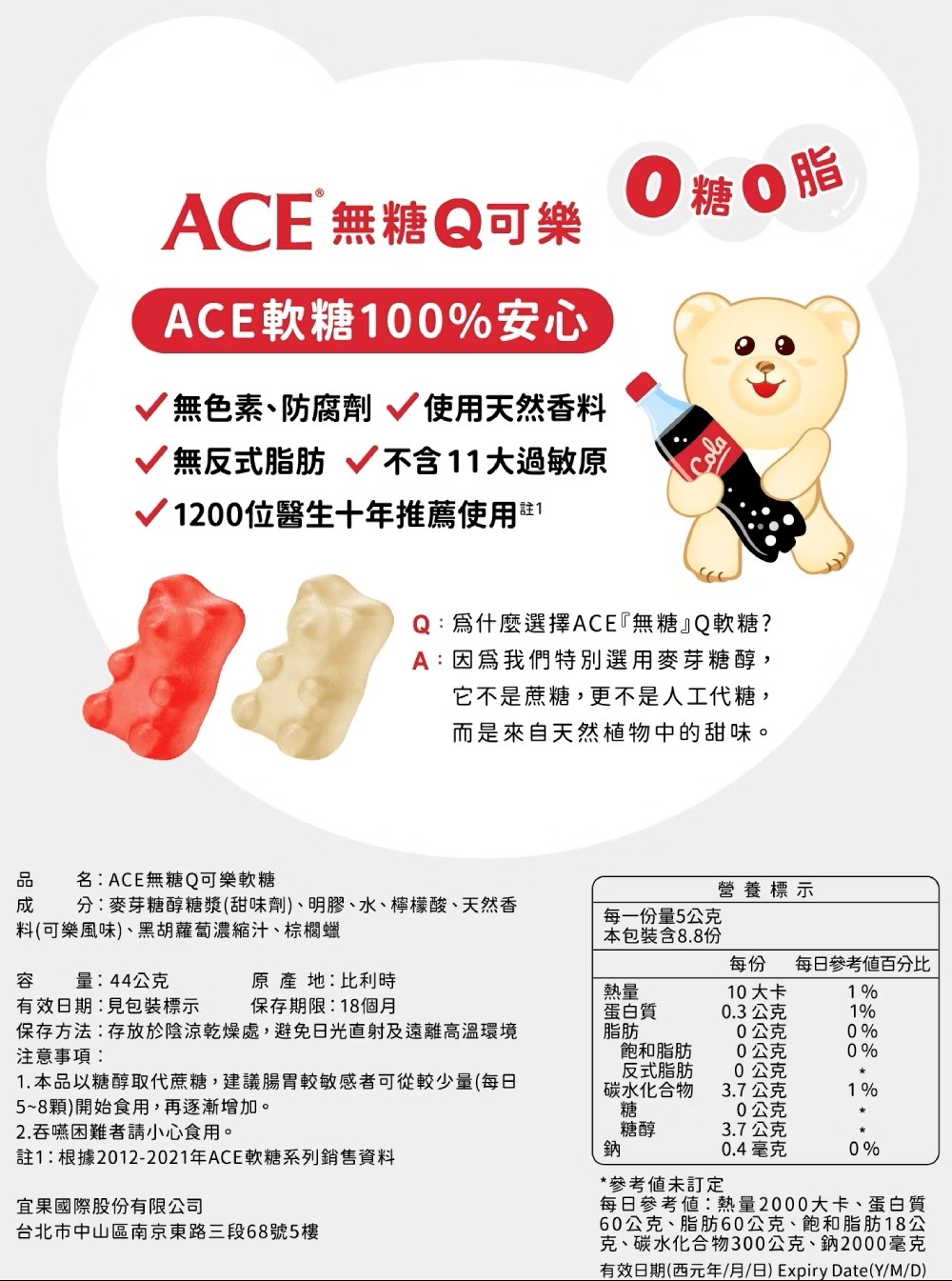 品名:ACE無糖Q可樂軟糖 產地:比利時 重量:44g& 220g 保存期限:18個月(總效期) 保存方法:請存放於陰涼乾燥處,避免日光直射及遠離高溫環境 營養標示:參考圖片 成分:麥芽糖醇糖漿(甜味劑)、明膠、水、檸檬酸、天然香料(可樂風味)、黑胡蘿蔔濃縮汁、棕櫚蠟
