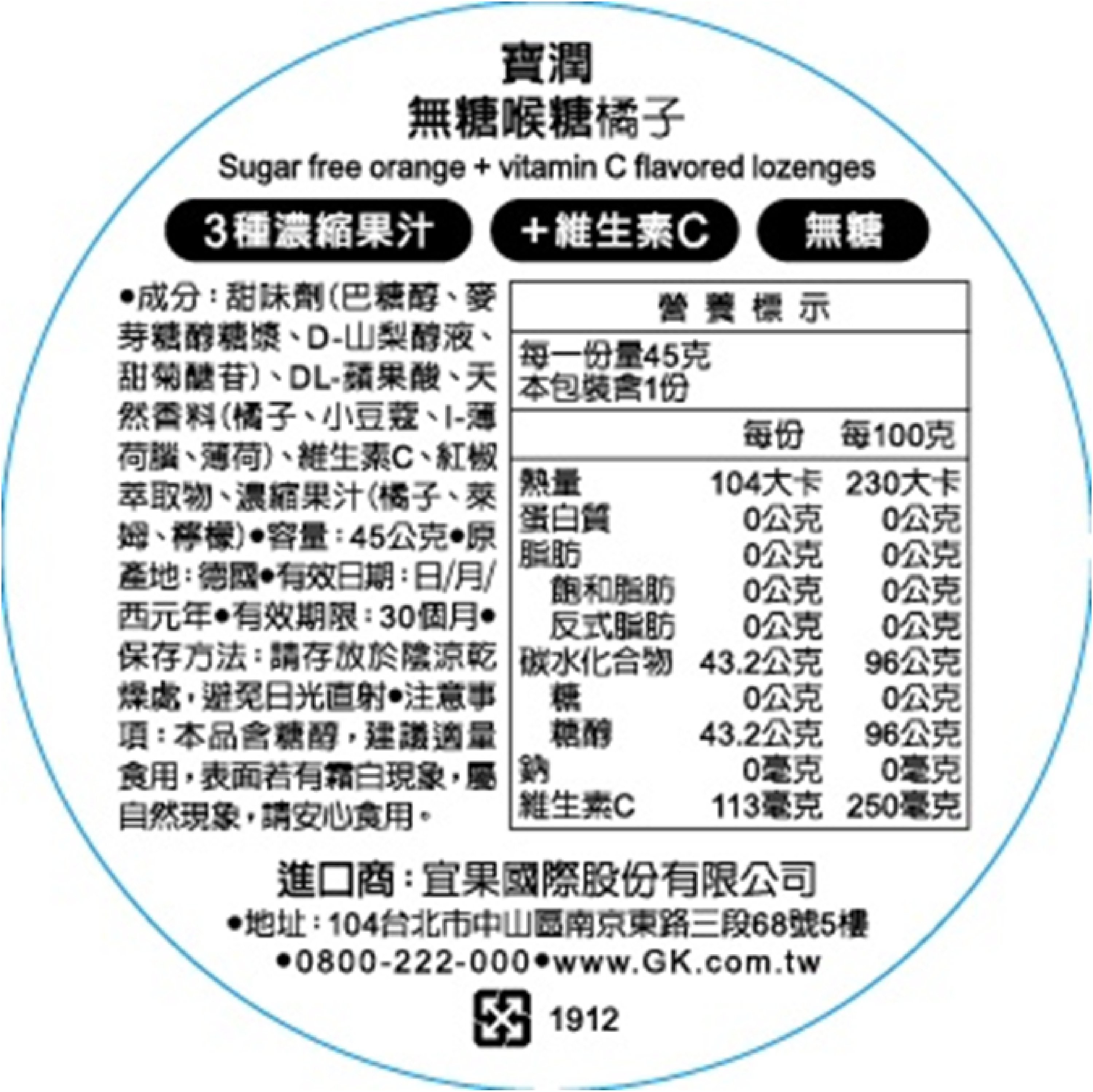 寶潤無糖潤喉糖45g-橘子