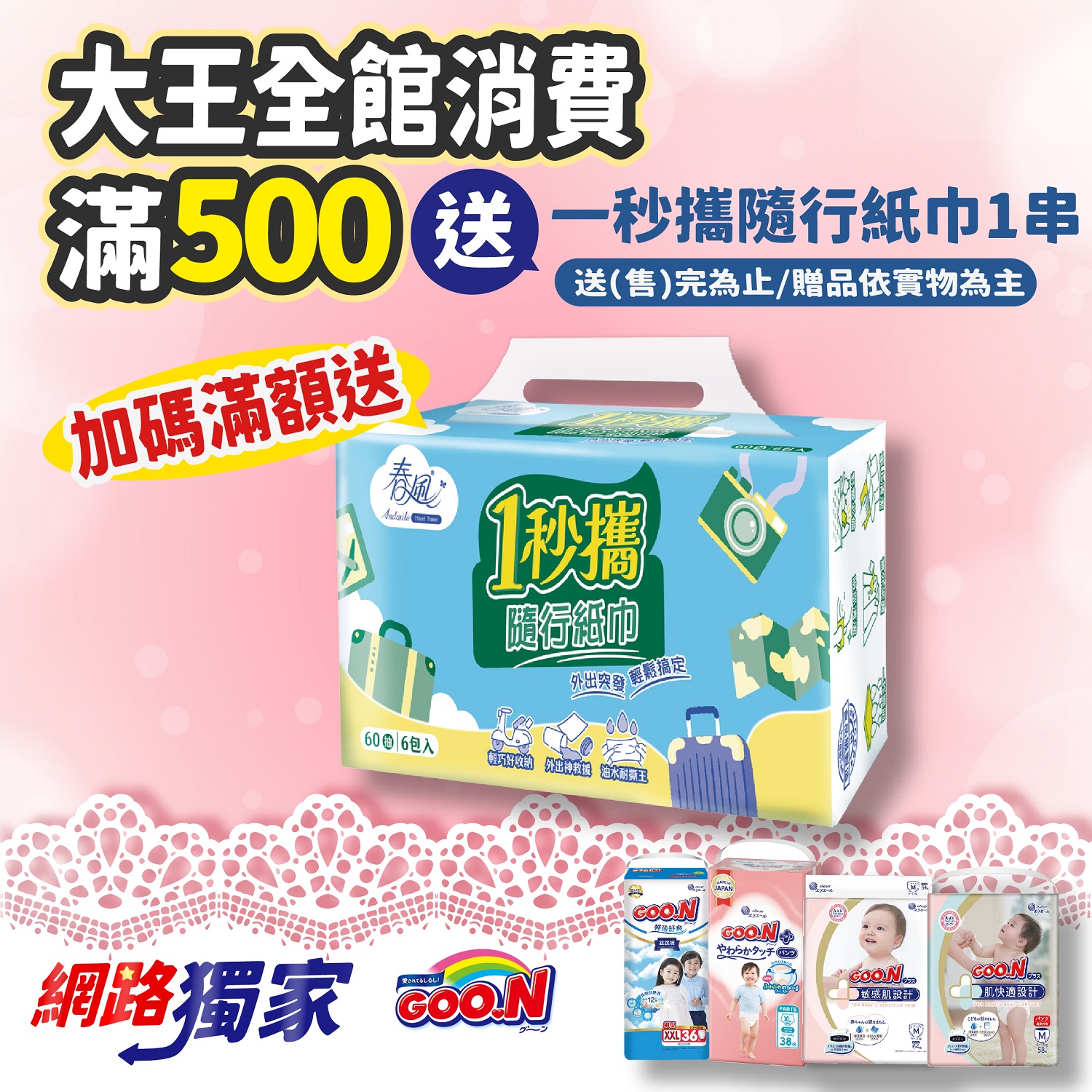 【網路獨家】全館大王滿500元,即送一秒攜隨行紙巾1串,送完為止,不累贈