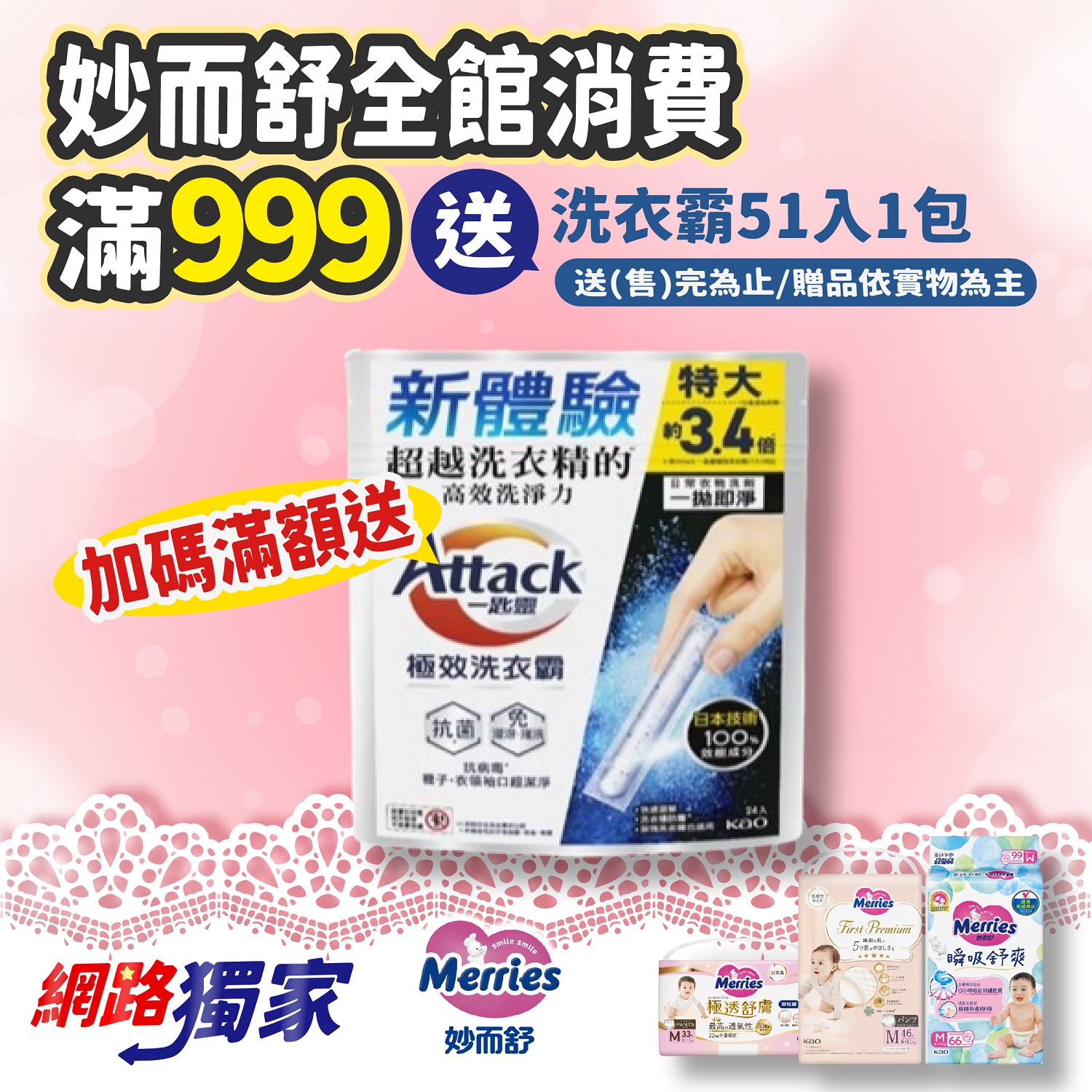 【網路獨家】全館妙而舒滿999元,送洗衣霸1包(51入),送完為止,不累贈
