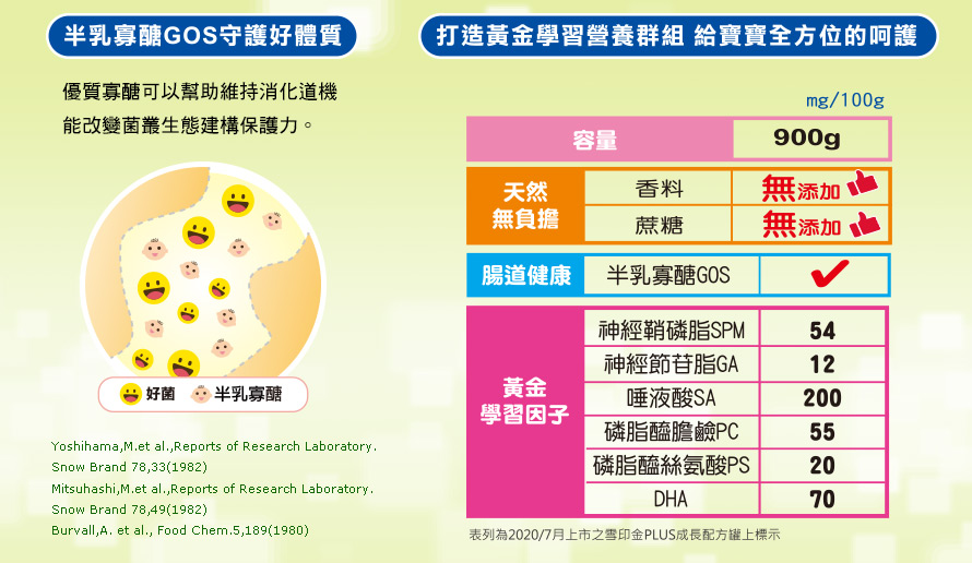 .成分:脫脂奶粉、乳糖、脫礦物質乳清粉、糊精、濃縮乳清蛋白、脫脂乳、棕櫚仁核油、大豆油、酪乳粉、高油酸葵花籽油、棕櫚油、磷酸鈣、精製魚油(含二十二碳六烯酸) 、氯化鉀、維生素C、乾酪素鈉、葡萄糖漿固形物、葡萄糖、碳酸鈣、檸檬酸鉀、氯化膽生僉、牛磺酸、肌醇、焦磷酸鐵、維生素E、硫酸鋅、菸鹼醯胺、本多酸鈣、椰子油、維生素A棕櫚酸酯、葡萄糖漿、硫酸銅、混和濃縮生育醇(抗氧化劑) 、高山被孢黴發酵產物(含花生四烯酸ARA) 、維生素B₆、維生素B₁、維生素D3、β-胡蘿蔔素、卵磷脂、維生素B₂、葉酸、L-抗壞血酸棕櫚酸酯(抗氧化劑) 、維他命K1、碘化鉀、磷酸氫二鉀、脂肪酸甘油酯、亞硒酸鈉、生物素、硫酸錳
